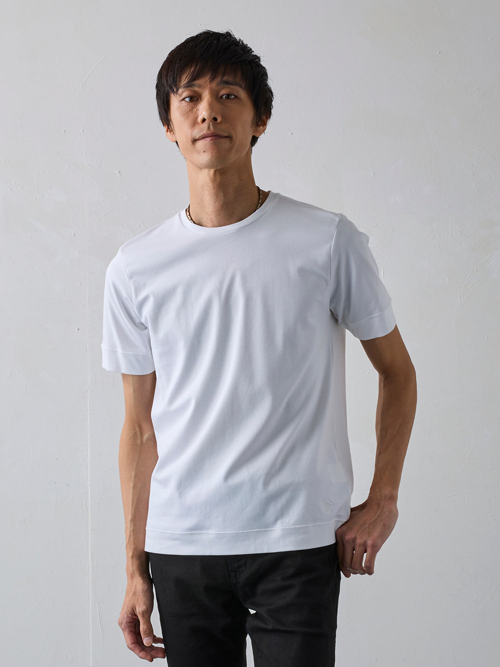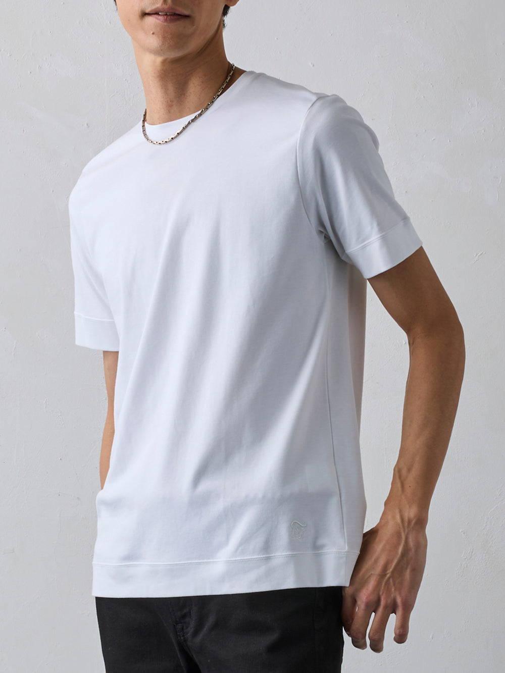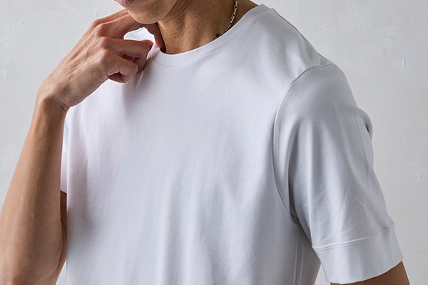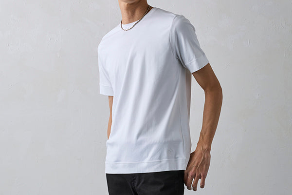 やや細めでスマートなシルエットは、上着を羽織っても違和感のない洗練された着心地を実現。ジャケットのインナーとしても、一枚着でも上品さを格上げする、大人のためのTシャツです。ビジネスカジュアルからオフシーンまで、幅広いシーンで活躍します。