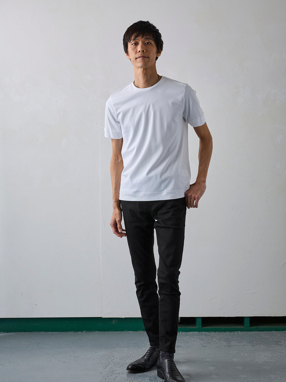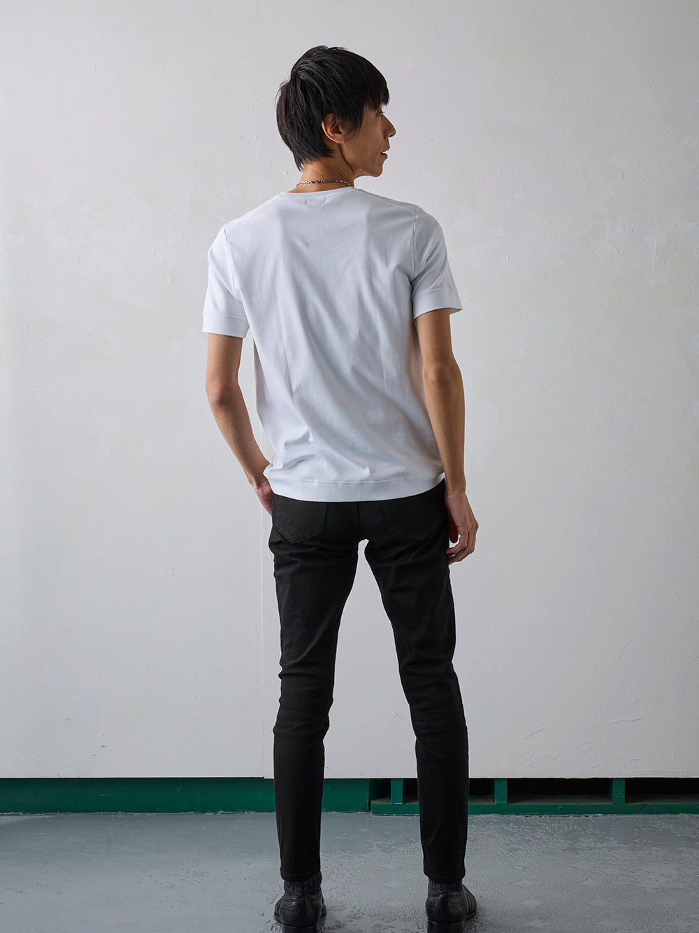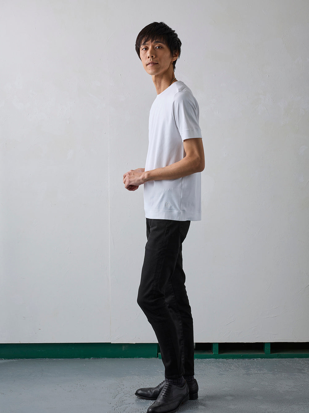 やや細めでスマートなシルエットは、上着を羽織っても違和感のない洗練された着心地を実現。ジャケットのインナーとしても、一枚着でも上品さを格上げする、大人のためのTシャツです。ビジネスカジュアルからオフシーンまで、幅広いシーンで活躍します。