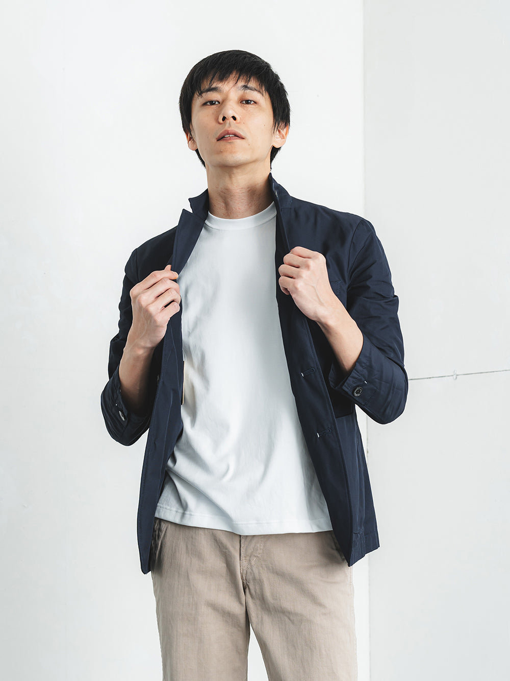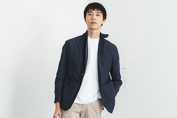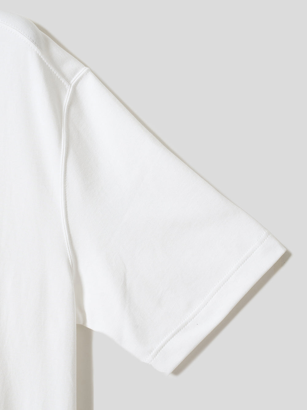 衿元を中心に肩ライン、アームラインに配した2本針ステッチが、洗練されたデザインアクセントに。職人の確かな技術を視覚的に表現し、ディテールへのこだわりを際立たせます。シンプルな中に宿る日本のものづくりの美しさを堪能できる一着です。