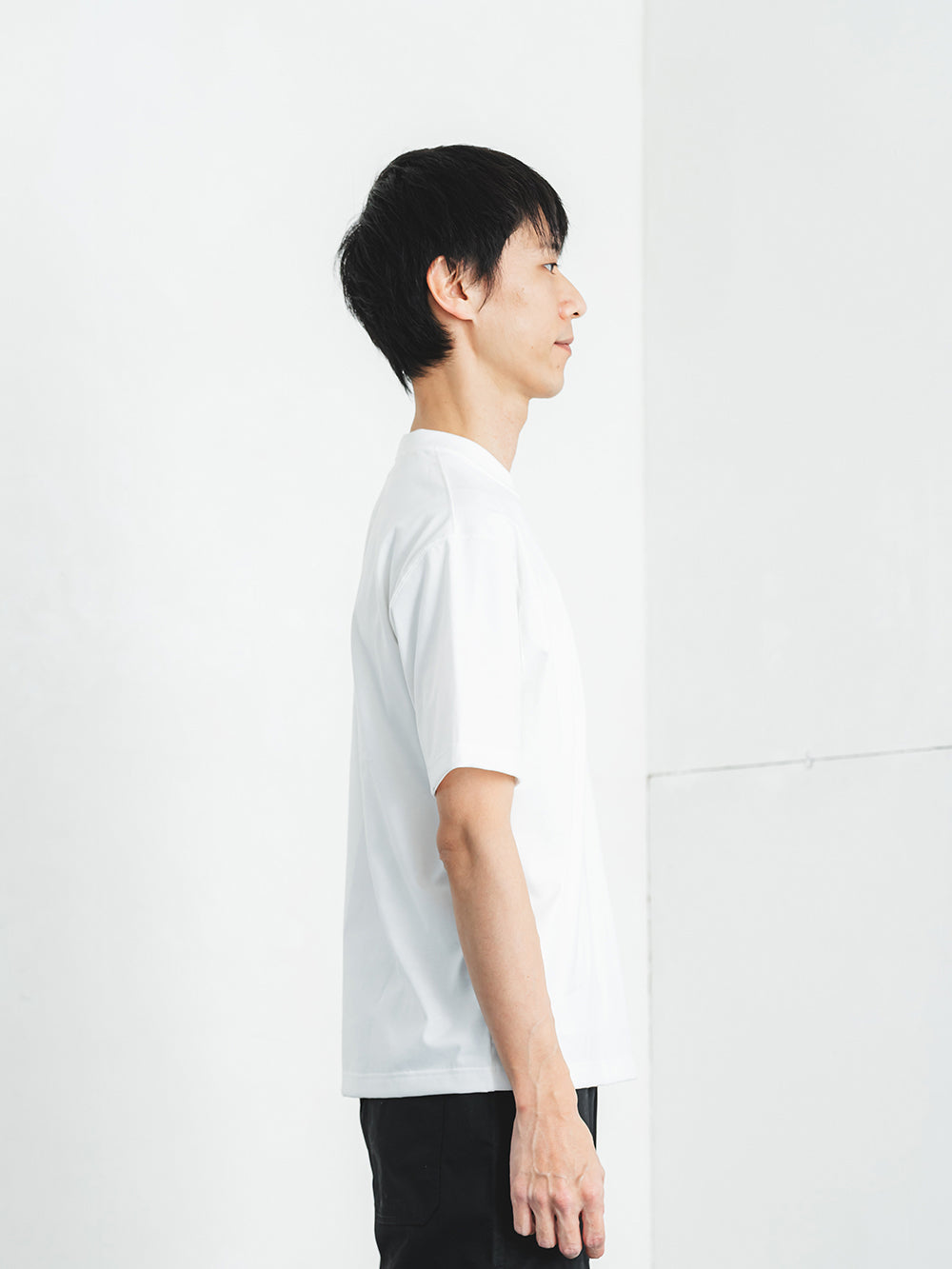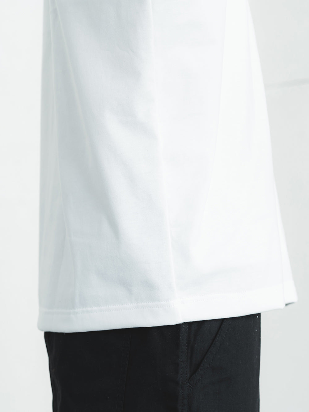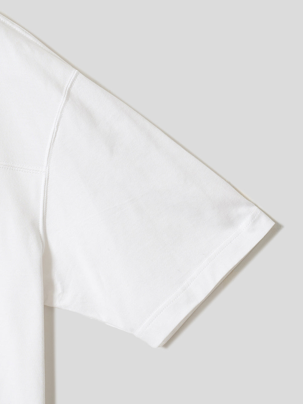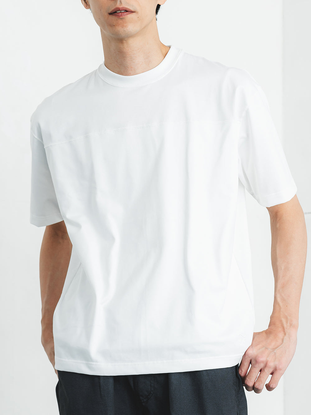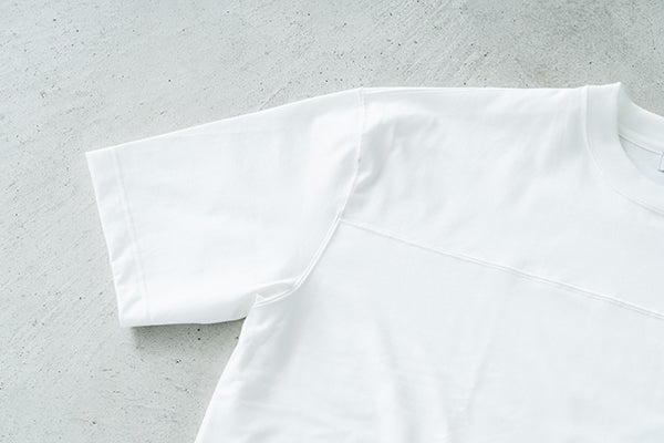 胸の切替線から裾にかけて生地を二重にすることで、乳首の透けや浮きを軽減。肩回りや背中、袖は1枚仕立てのため、着心地や暑さへの影響を最小限に抑えました。切替の上には3本針を使用し、カジュアルな存在感を演出します。