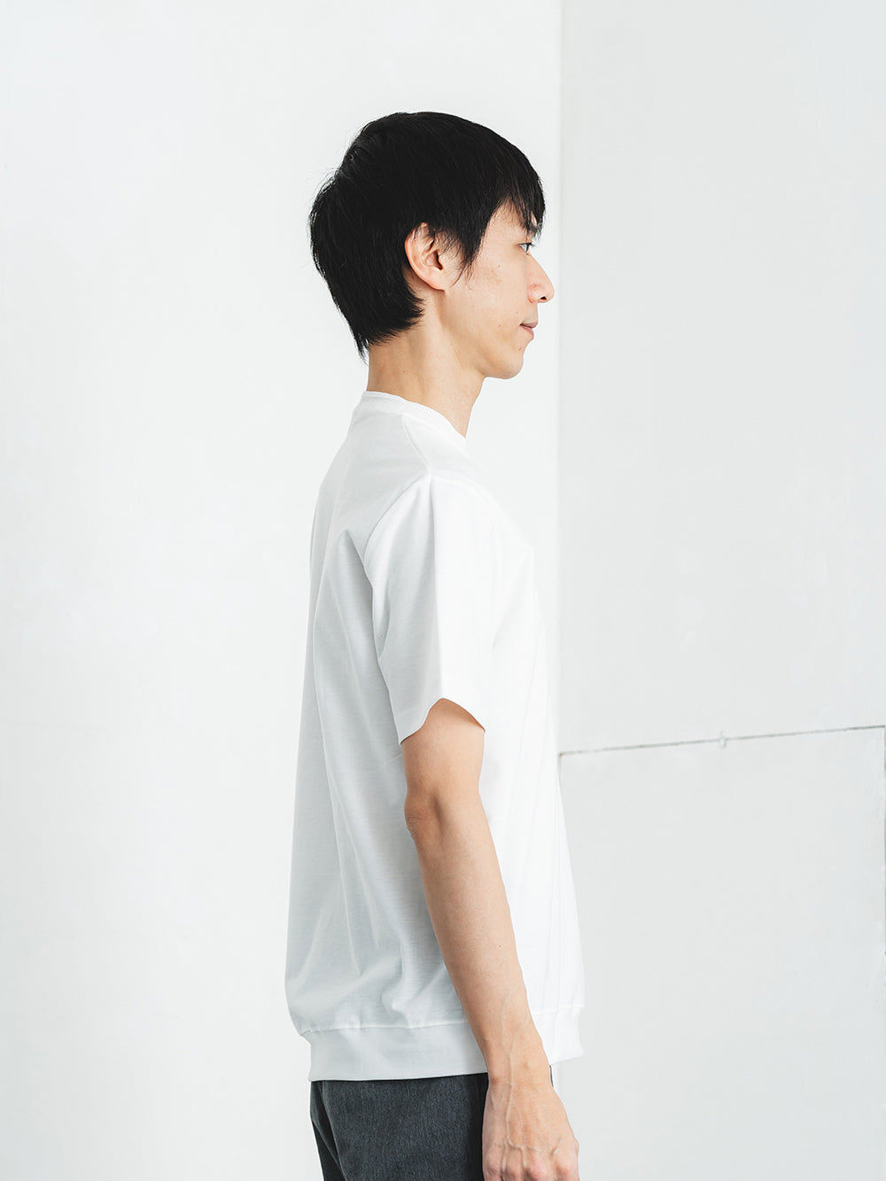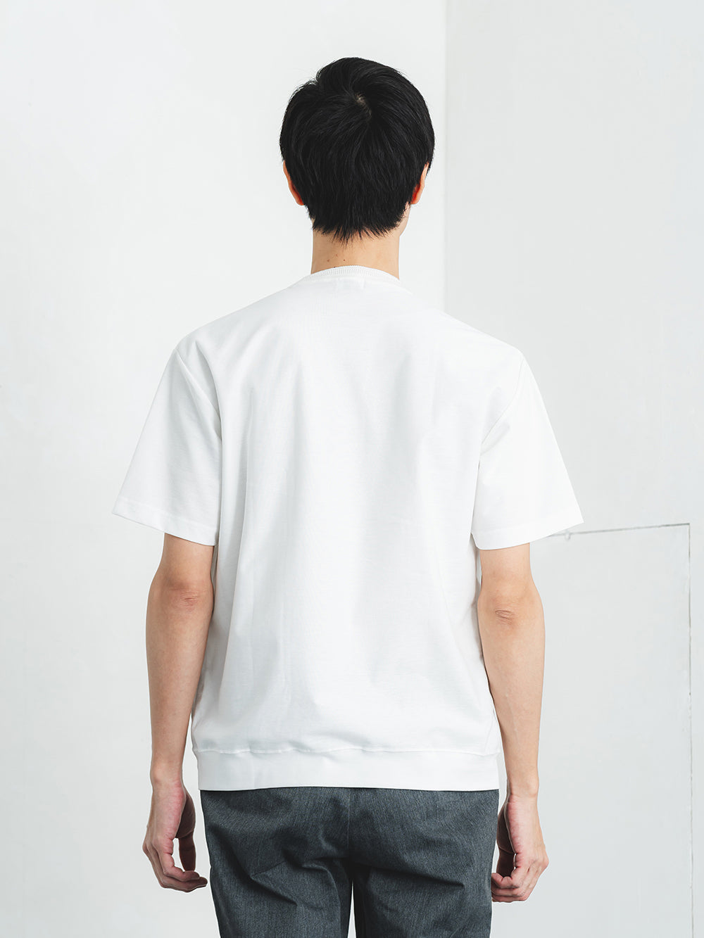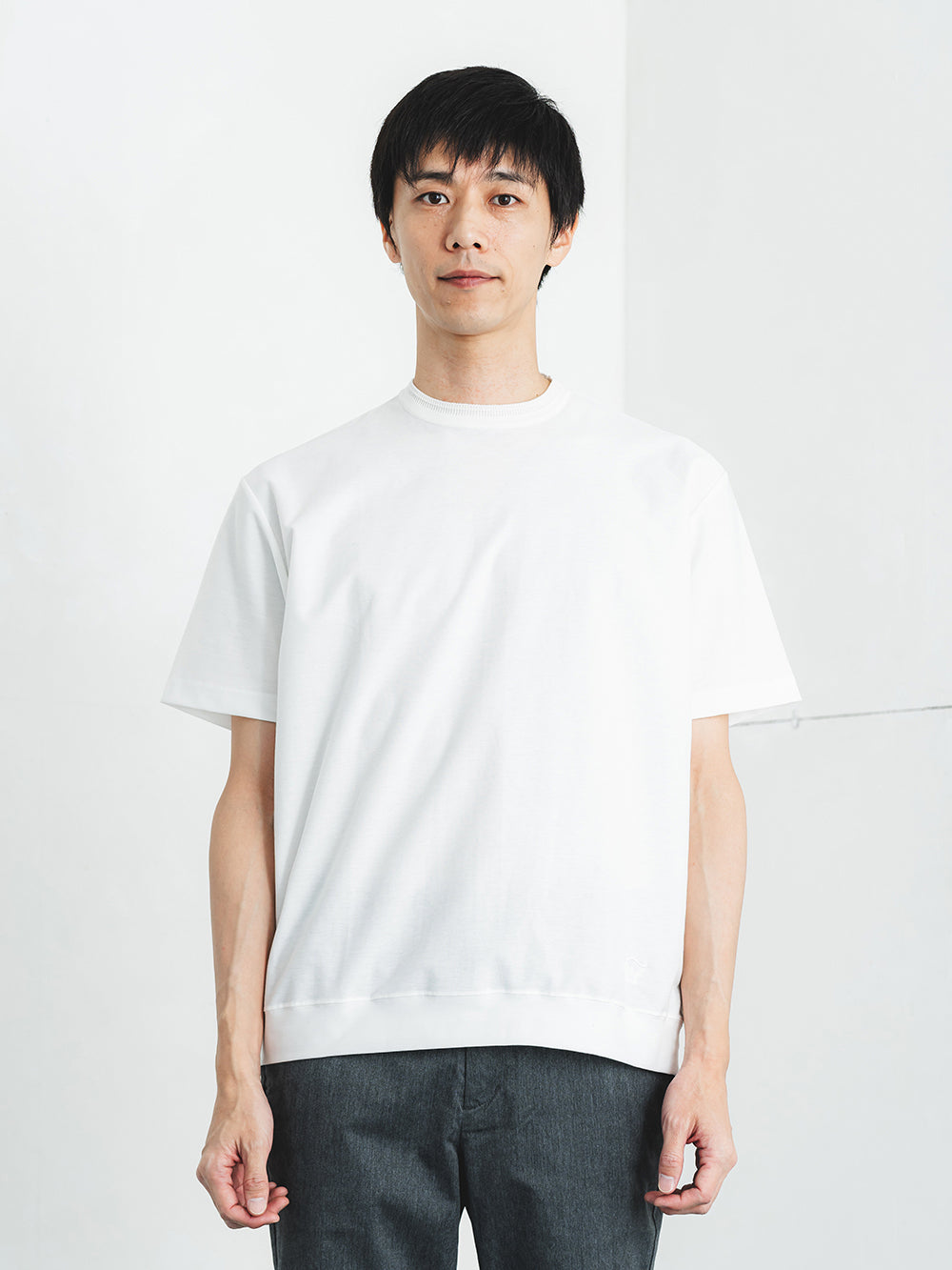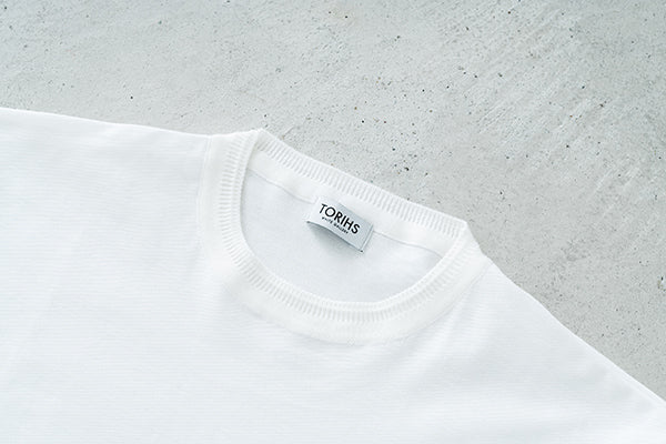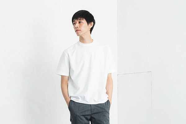 ネックには職人の技が光るリンキング縫いを採用。ニット製品ならではの高度な縫製技術が、美しい仕上がりと快適な着心地を両立します。裾に切り替えを入れることでアウター要素を表現し、カジュアルながらも洗練された印象に。シンプルな中にディテールへのこだわりが宿る、日本のものづくりの真髄を体感できる一着です。