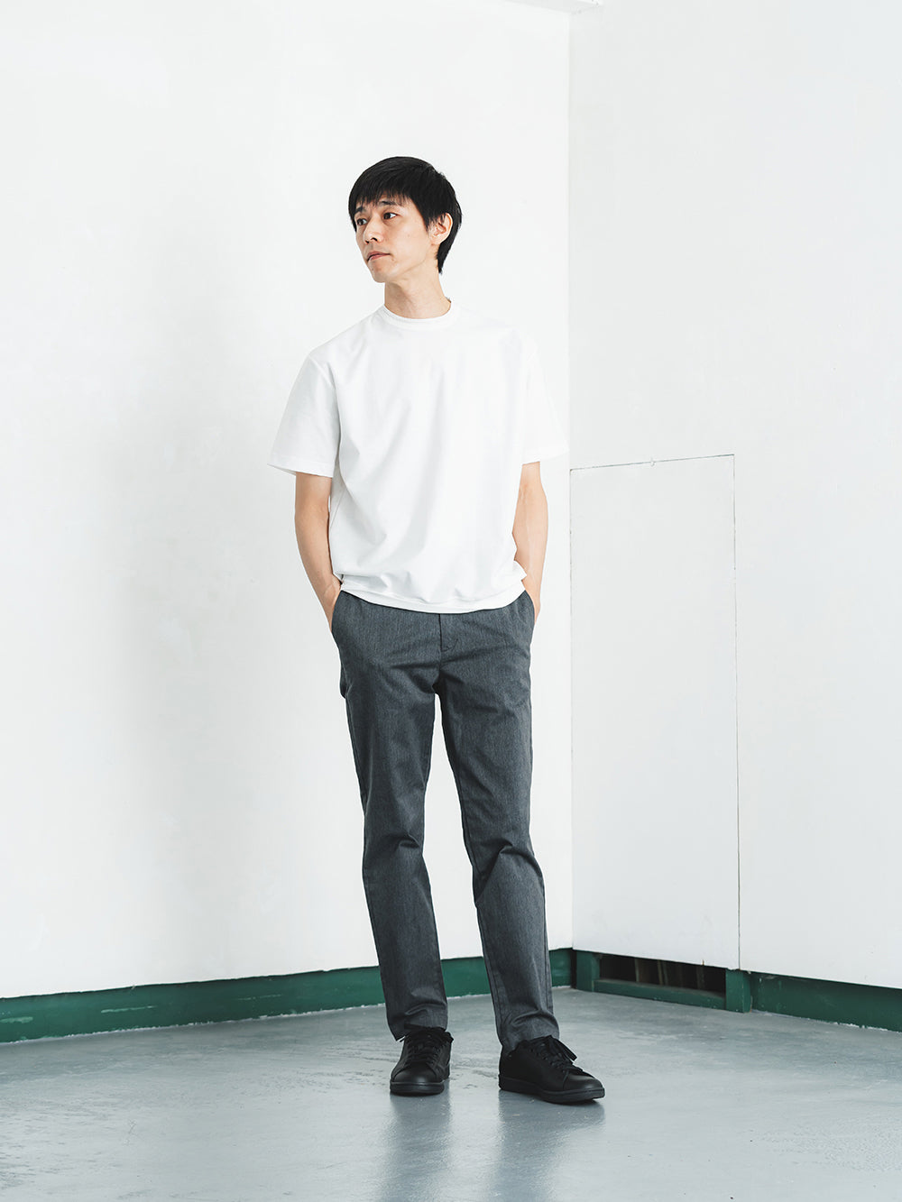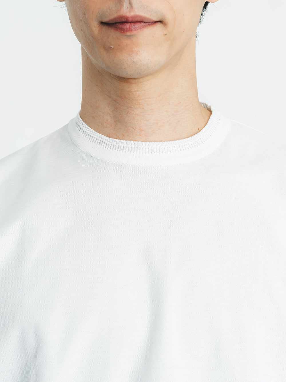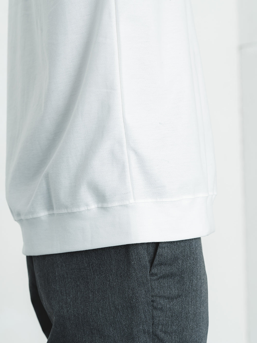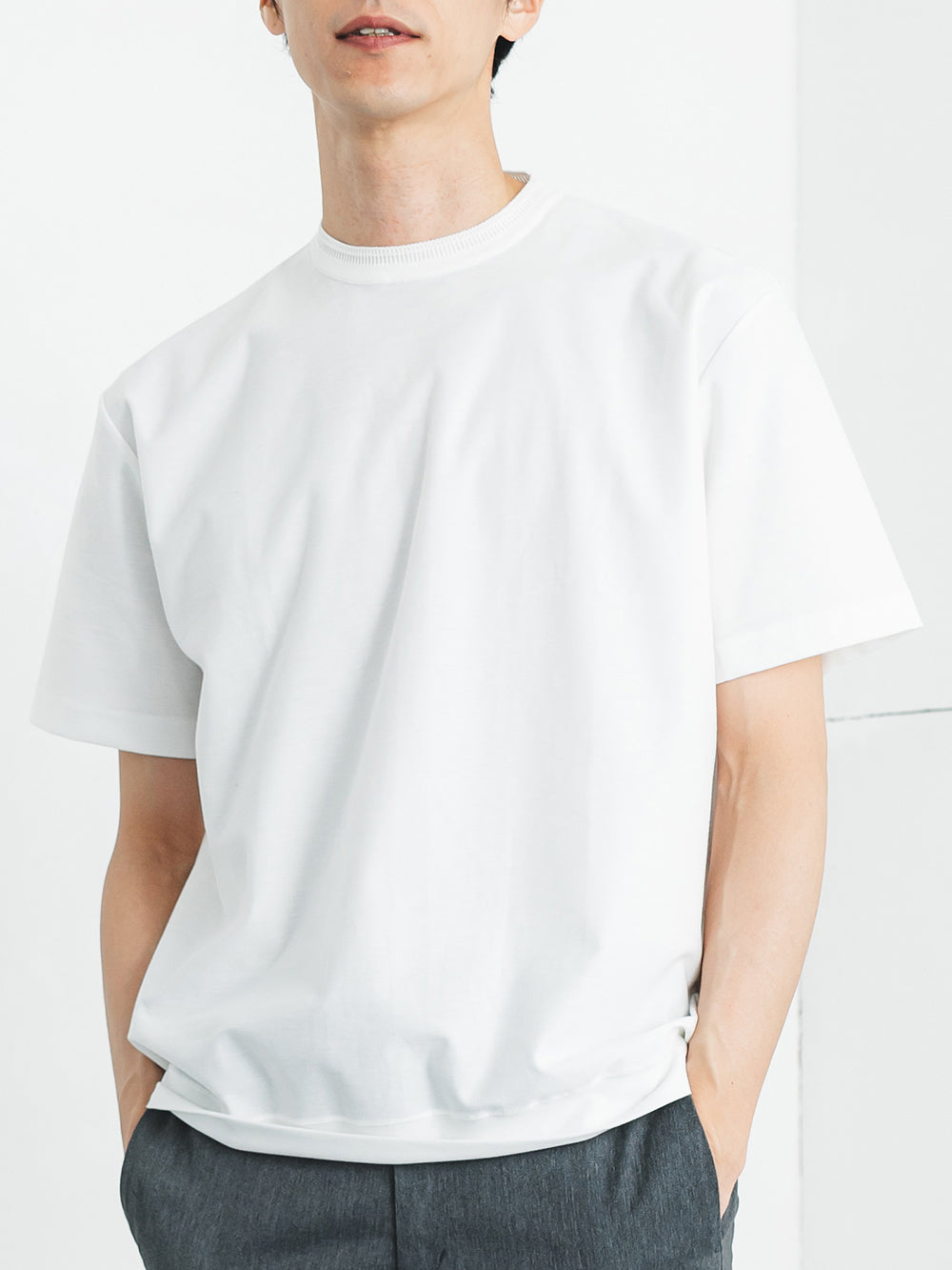 ネックには職人の技が光るリンキング縫いを採用。ニット製品ならではの高度な縫製技術が、美しい仕上がりと快適な着心地を両立します。裾に切り替えを入れることでアウター要素を表現し、カジュアルながらも洗練された印象に。シンプルな中にディテールへのこだわりが宿る、日本のものづくりの真髄を体感できる一着です。