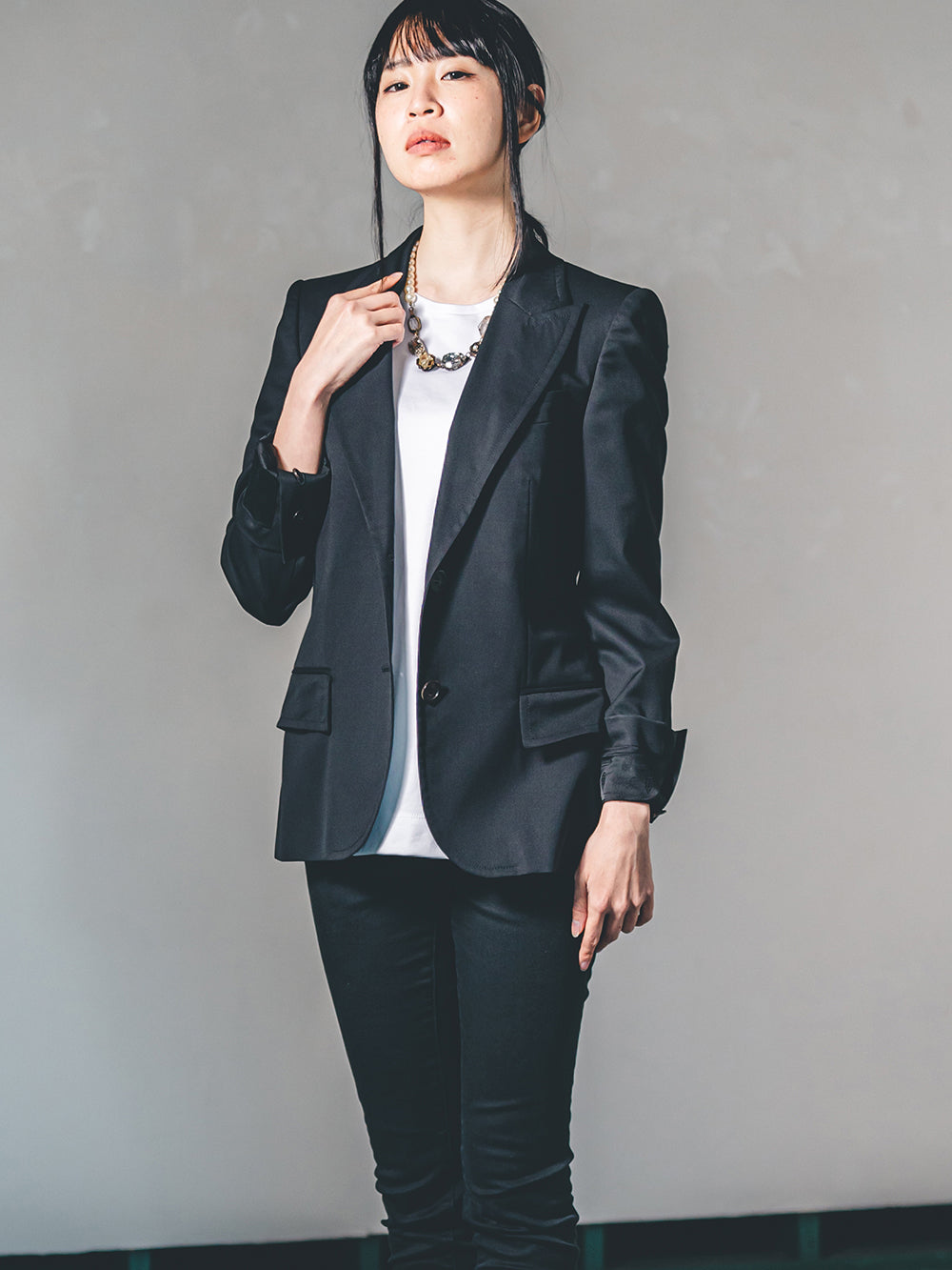 やや細めの衿とほどよく体のラインに沿うデザインが、洗練されたドレッシーな印象に。少し長めの袖丈は、ビジネスシーンやフォーマルな場面に最適です。