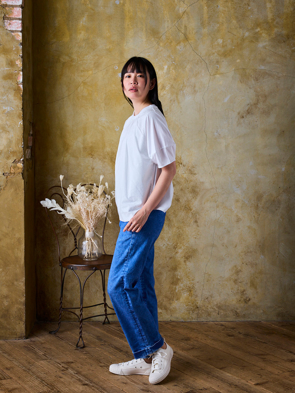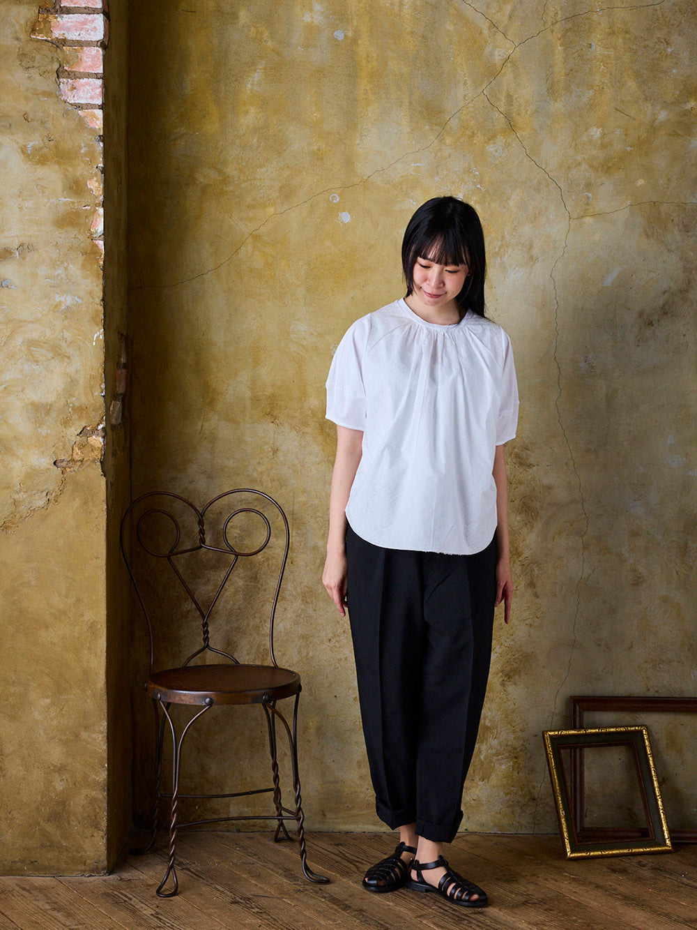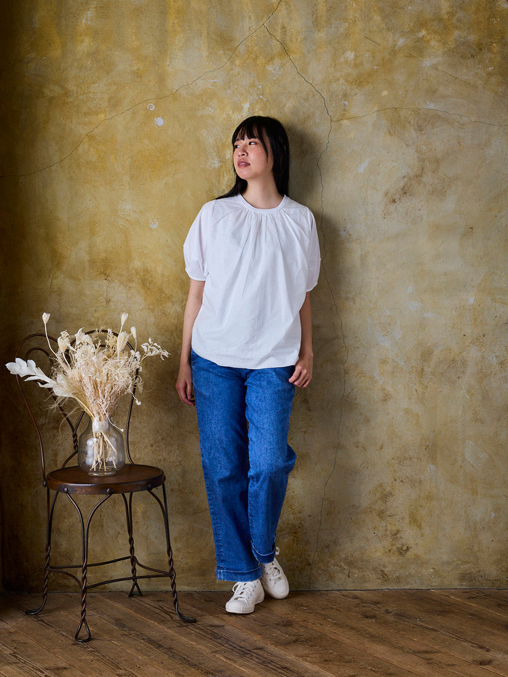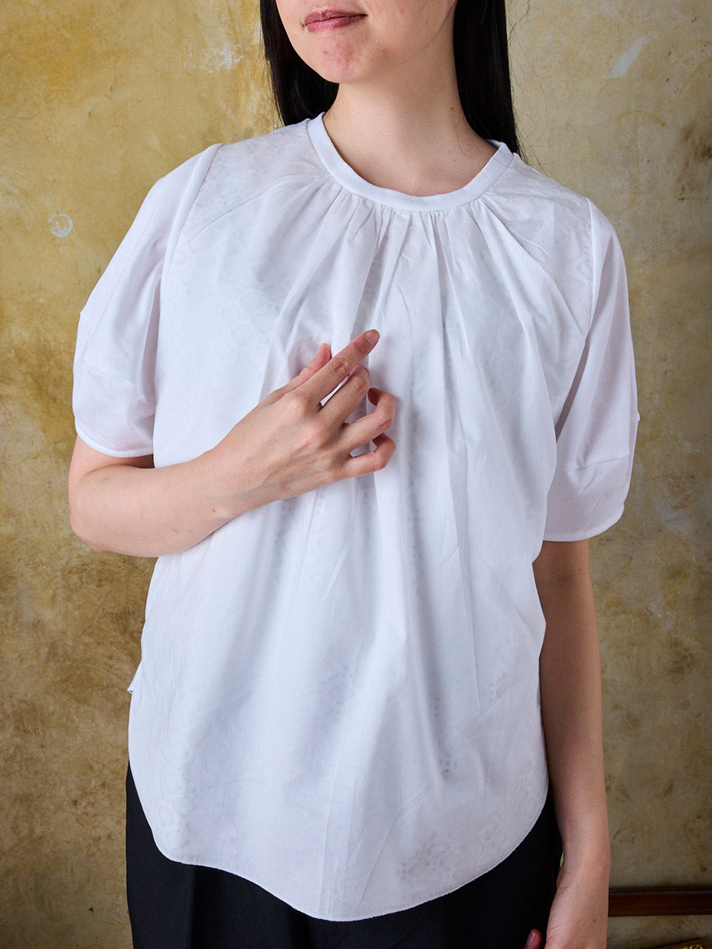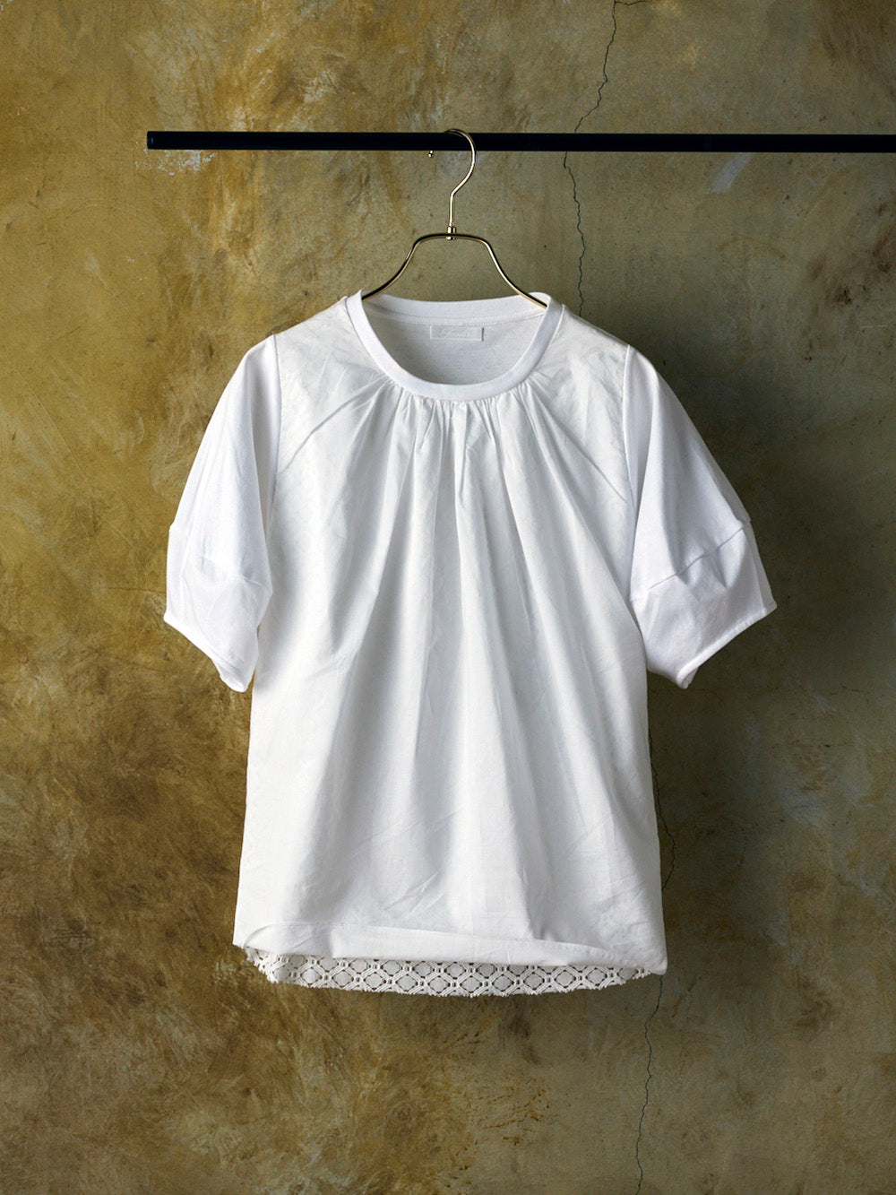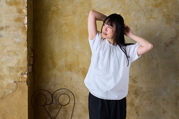 一見シンプルな白Tに見えますが、光の具合によってレースの透け感が変わる魅力的なデザイン。パフスリーブタイプの袖が丸みを出し、柔らかく可愛らしい印象を添えます。気になる二の腕もさりげなくカバーします。