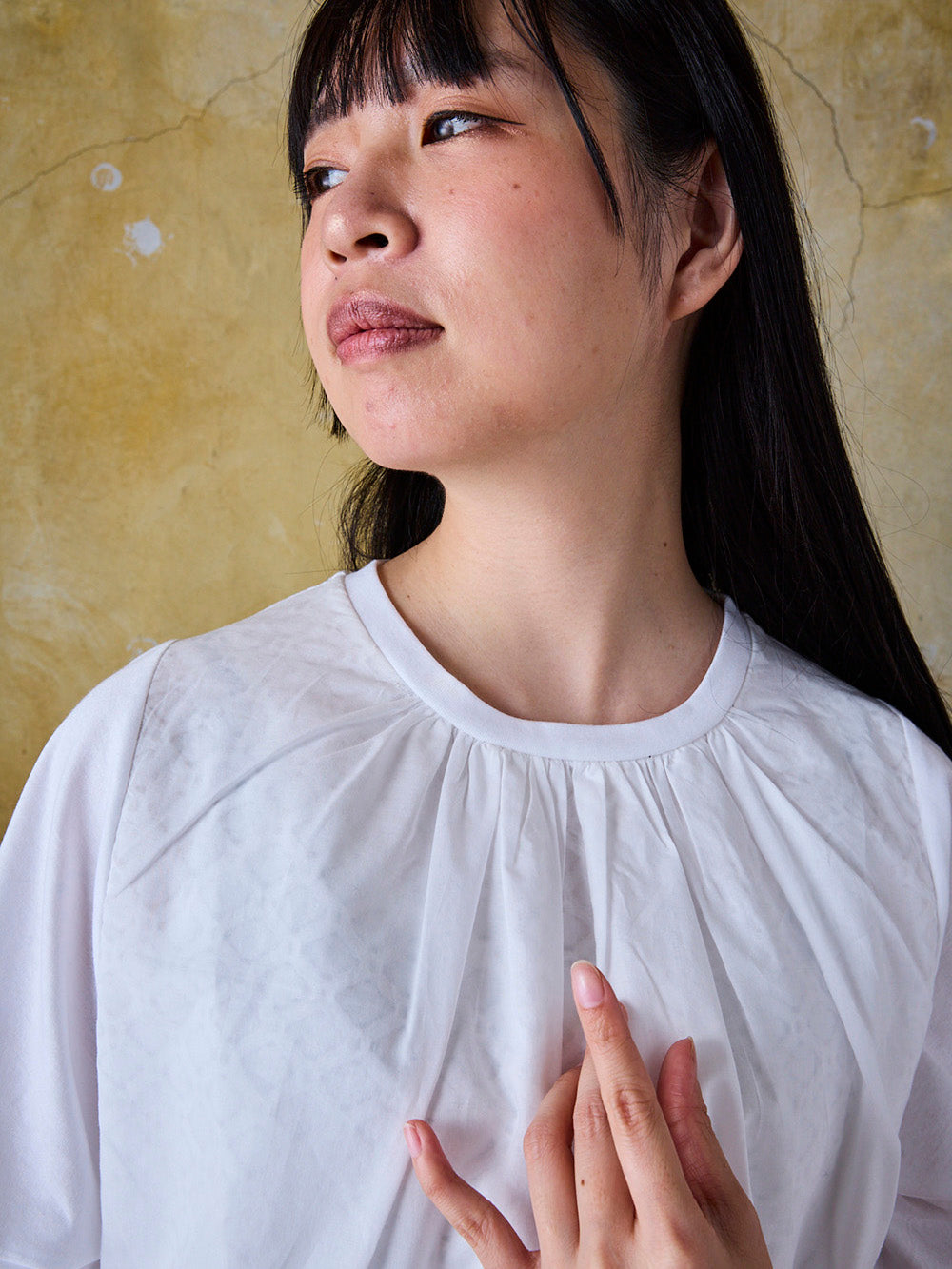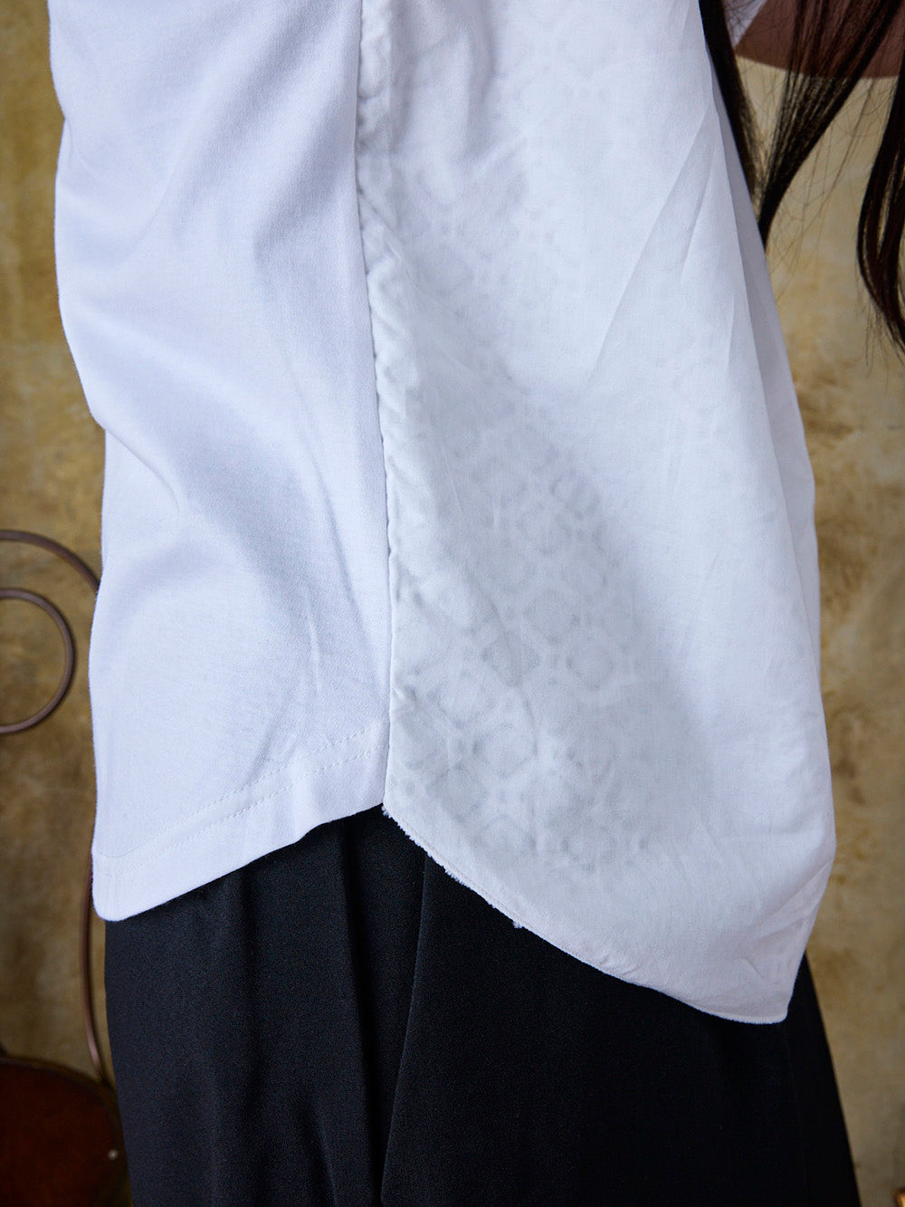 前身は極薄のボイル生地の下にレースがあり、インナーが透けにくく清涼感を実現。後身の生地は超長綿を使用したスムースで、表面をフラットにするバイオ加工と、シルクのような滑らかさと光沢を出すシルケット加工を施しています。