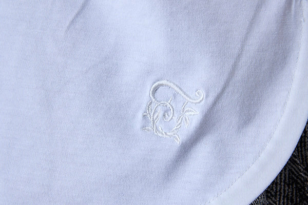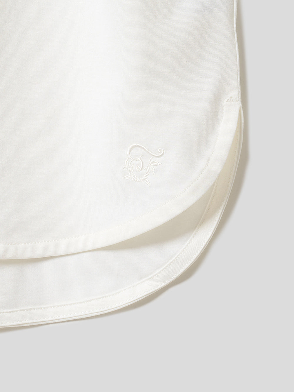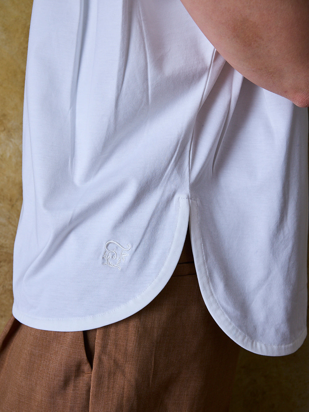 ゆとりのあるワイドシルエットで、快適な着心地を実現。裾は丸くカットしたラウンドヘムで、脇の締め付けを軽減します。リラックス感がありながらも、洗練された印象を保ちます。