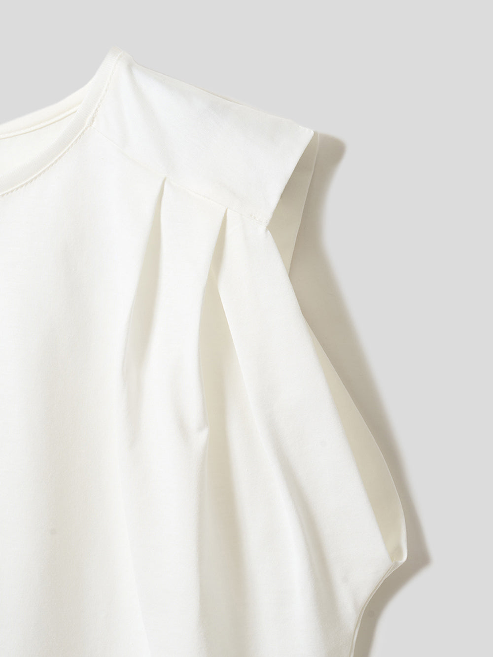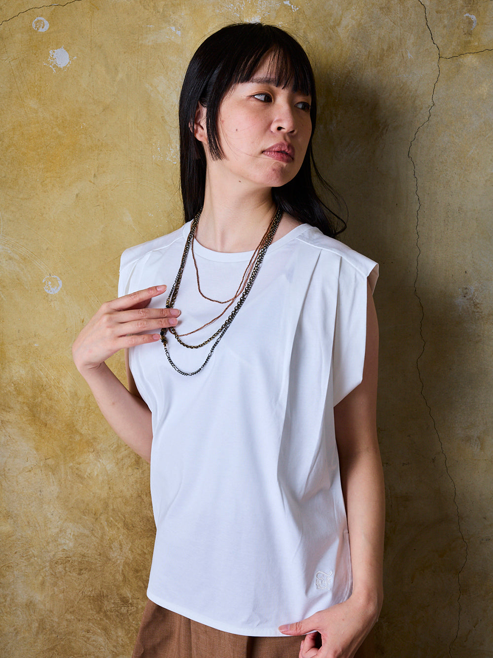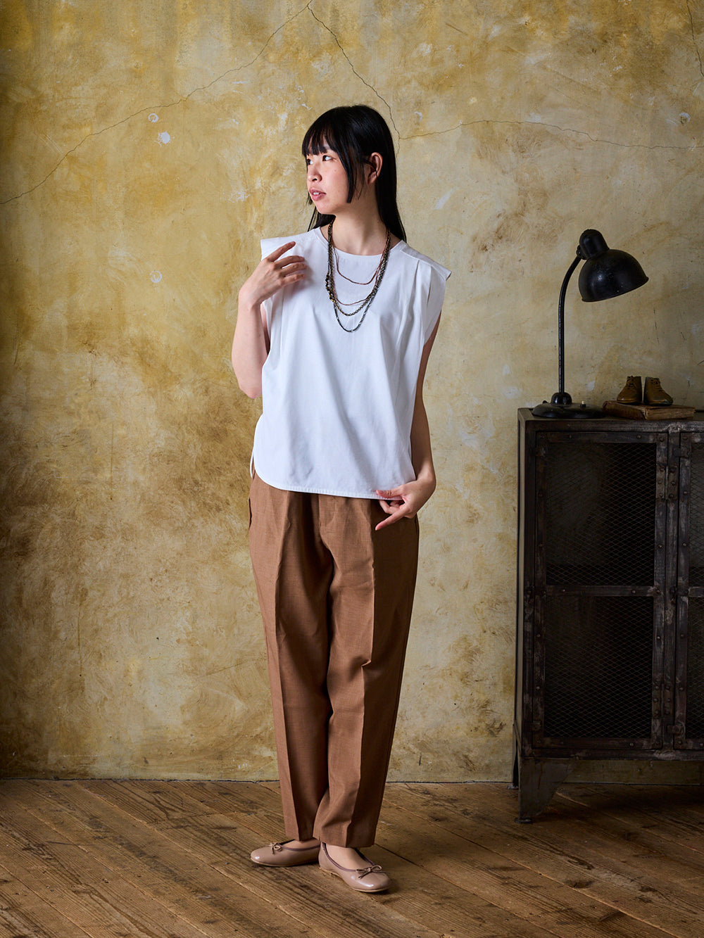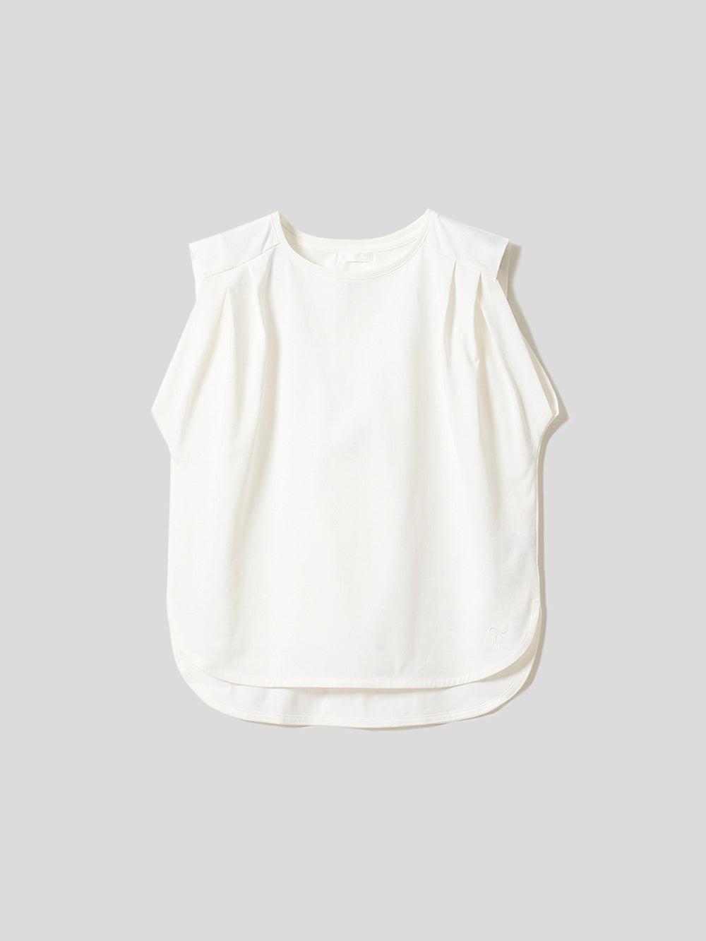 暑い夏にぴったりのノースリーブ。ヨーク部分にプリーツを入れ、立体感を出すことで二の腕が見えにくくシャープな印象に。ノースリーブに抵抗がある方にもおすすめのデザインです。