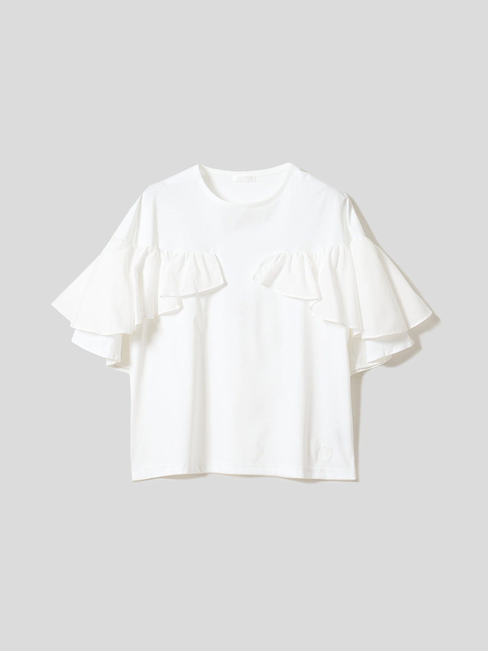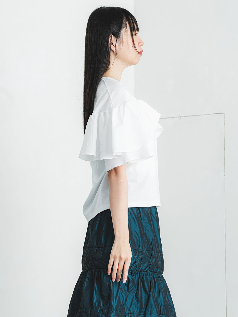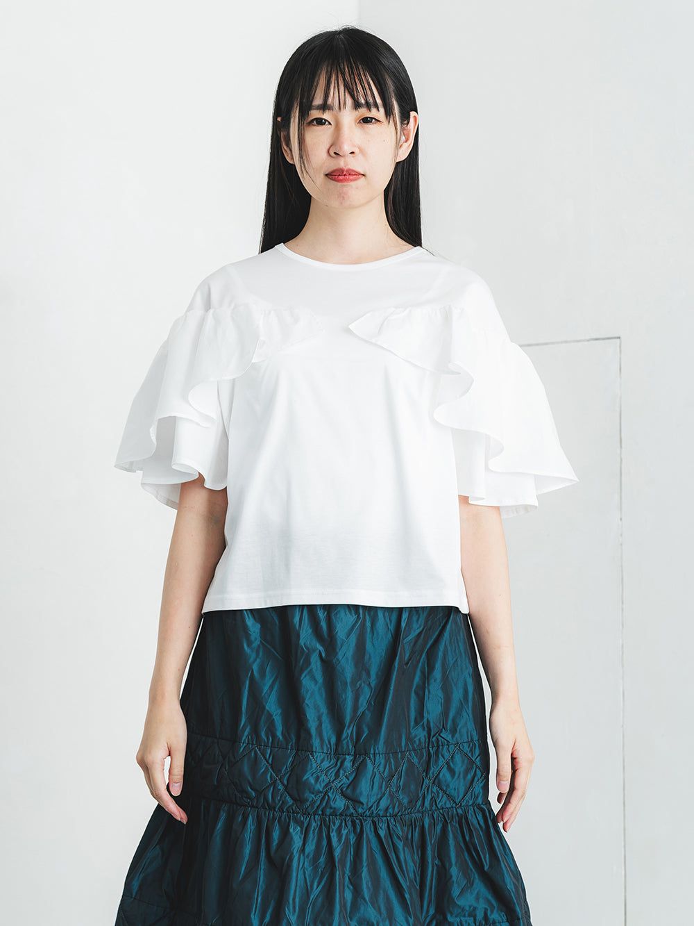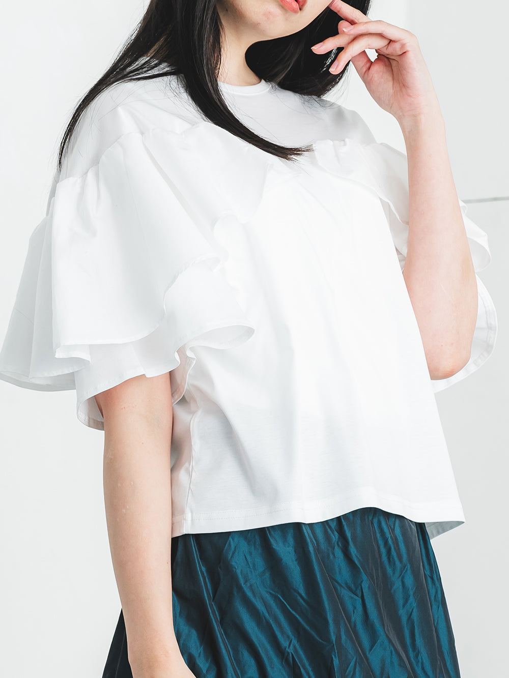 Tシャツ本体とは別布でフリルを配し、天使の羽根のようなフェミニンなデザインに。前身だけでなく、後身にもフリルがあり、360度どこから見ても魅力的です。