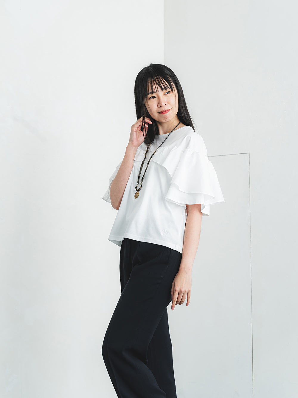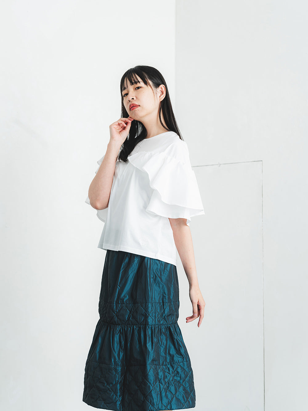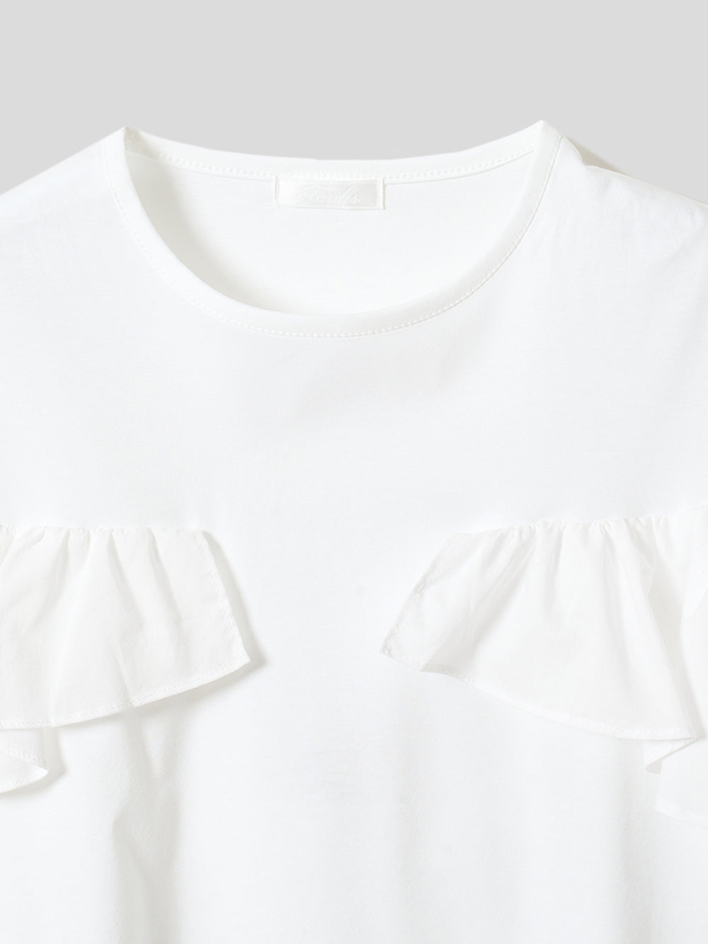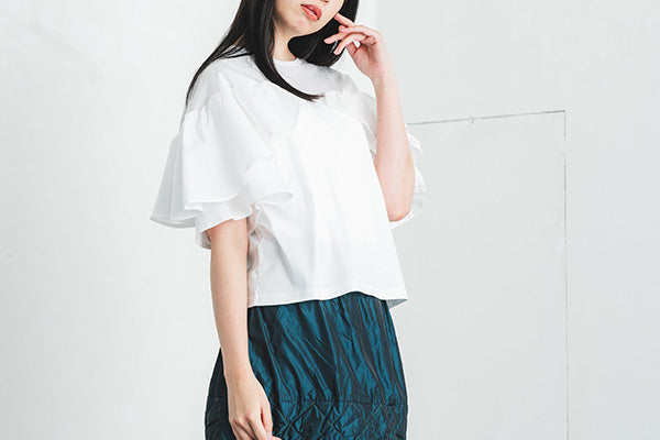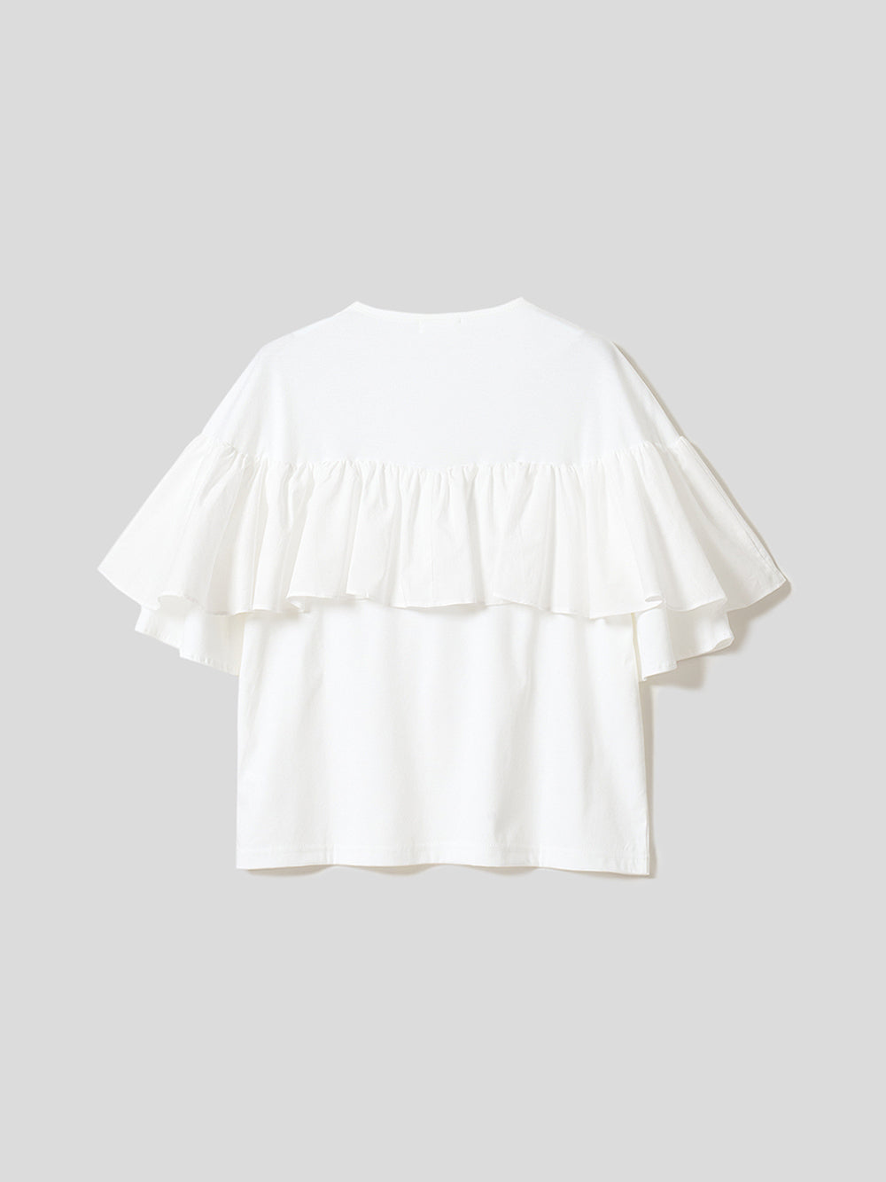 Tシャツ本体とは別布でフリルを配し、天使の羽根のようなフェミニンなデザインに。前身だけでなく、後身にもフリルがあり、360度どこから見ても魅力的です。
