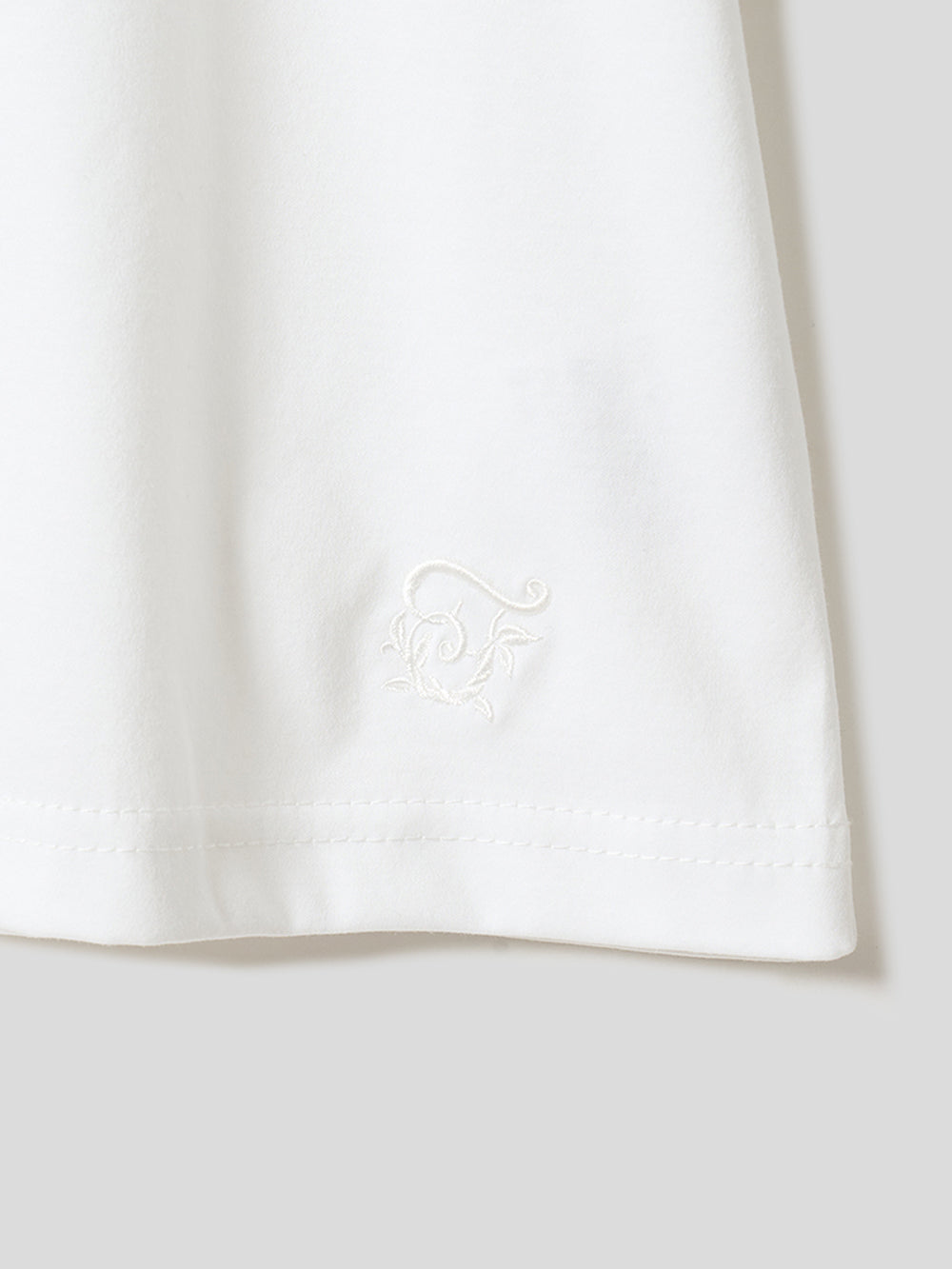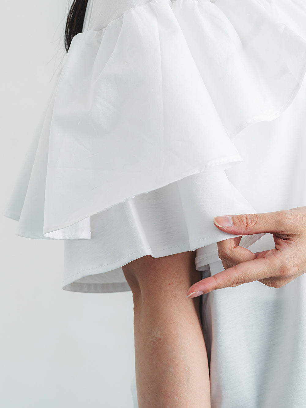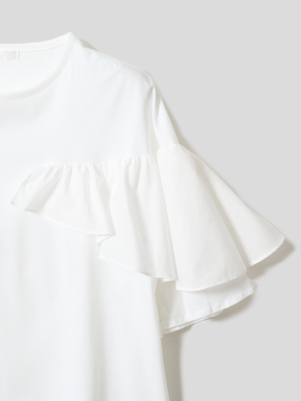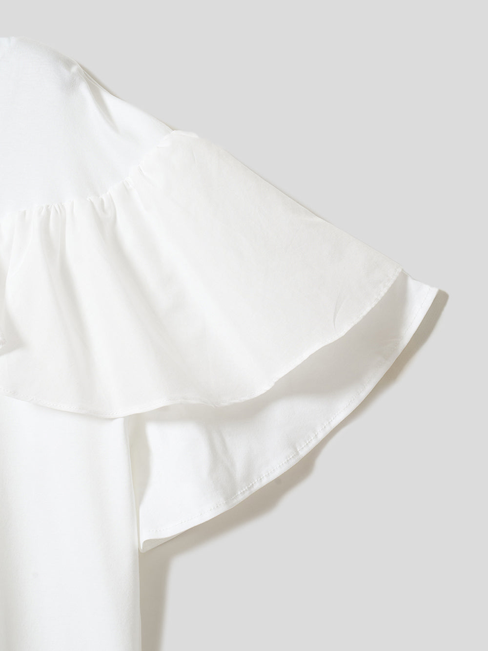 Tシャツ本体とは別布でフリルを配し、天使の羽根のようなフェミニンなデザインに。前身だけでなく、後身にもフリルがあり、360度どこから見ても魅力的です。
