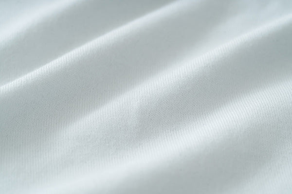 本体は40/2 high Gauge Jersey & Ribを使用。28Gというハイゲージ編み機で目を詰めて仕上げることで、適度な光沢とやや張りのある生地に。リボンには表面にツヤと光沢があるサテンリボンを採用。滑らかな手触りと高級感が特徴です。