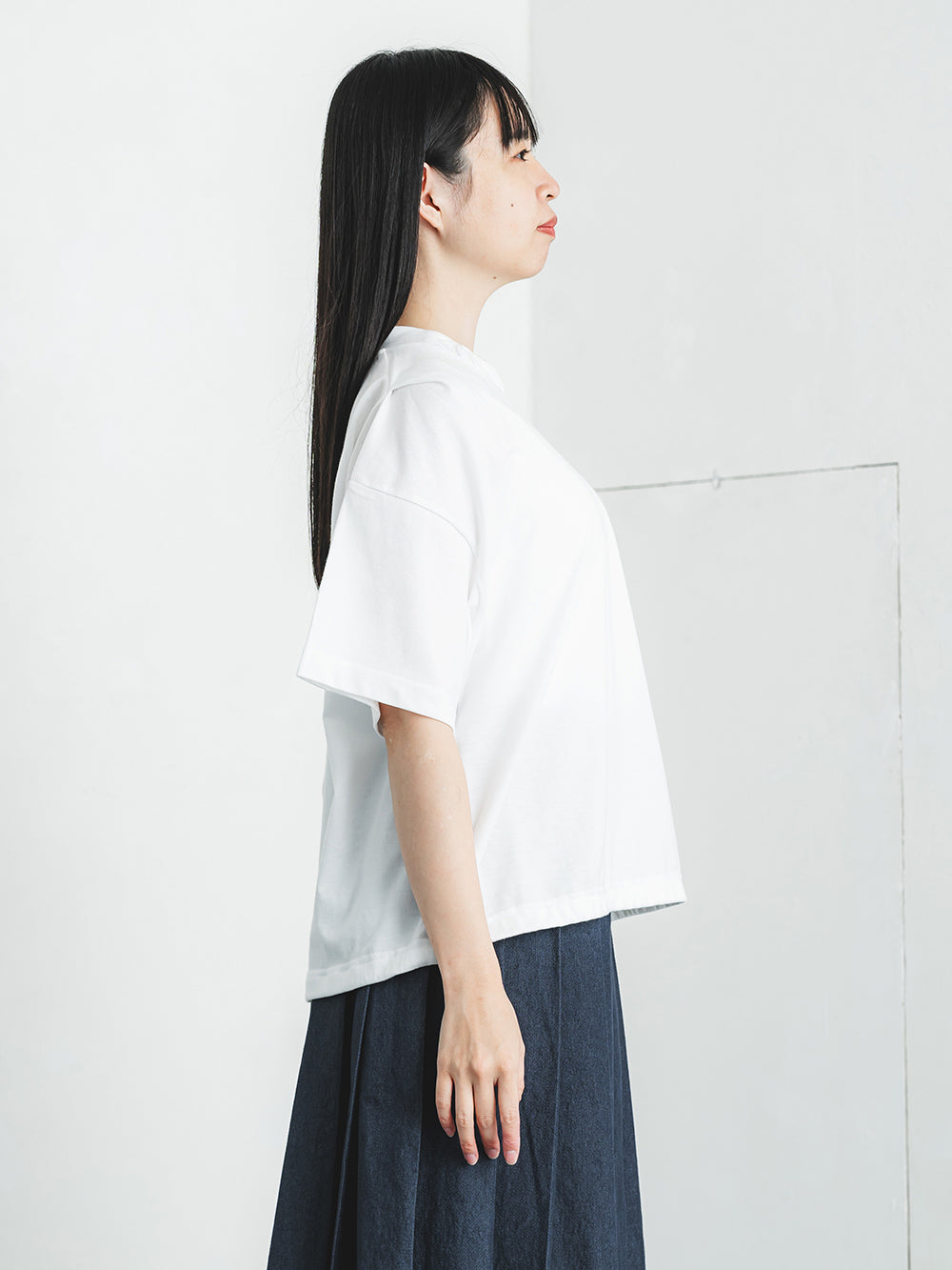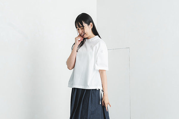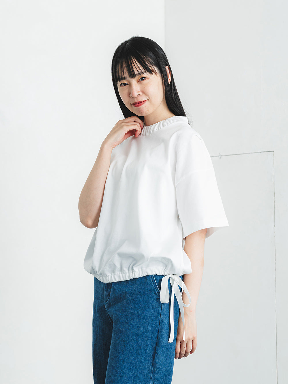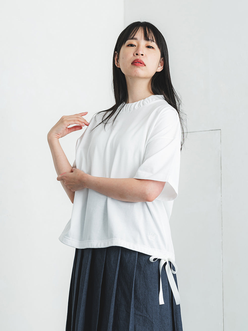 肩ラインにタックを入れ、肩幅が広がるデザインに。衿にはギャザー、裾にはサテンリボンテープを配し、シンプルでワイドなだけでなく、1枚で十分にお洒落ができる白Tに仕上げました。