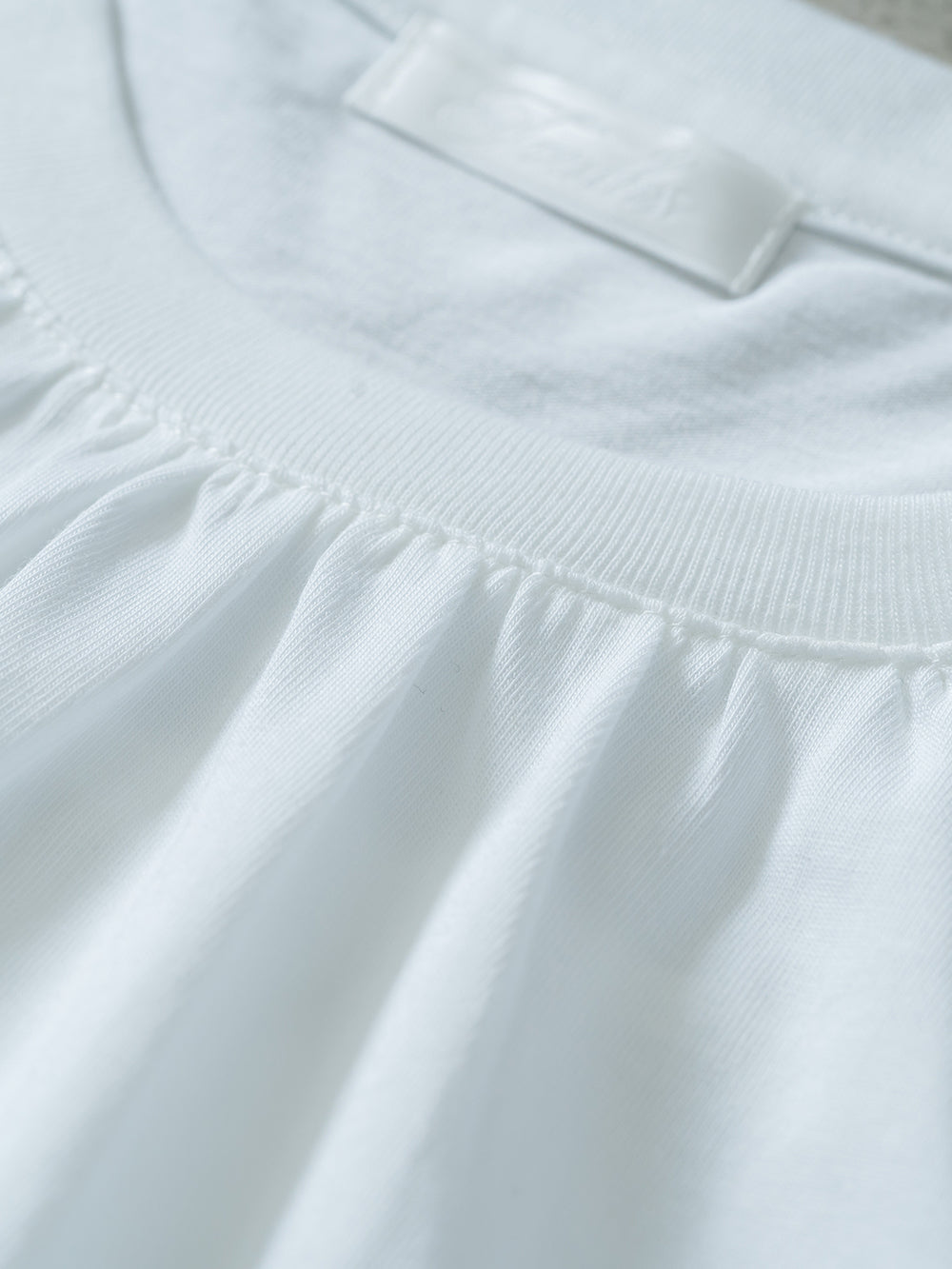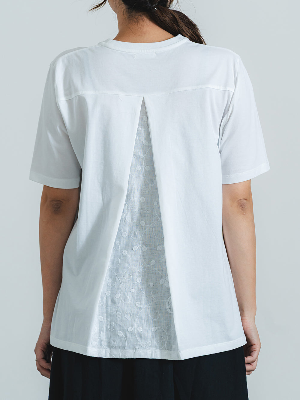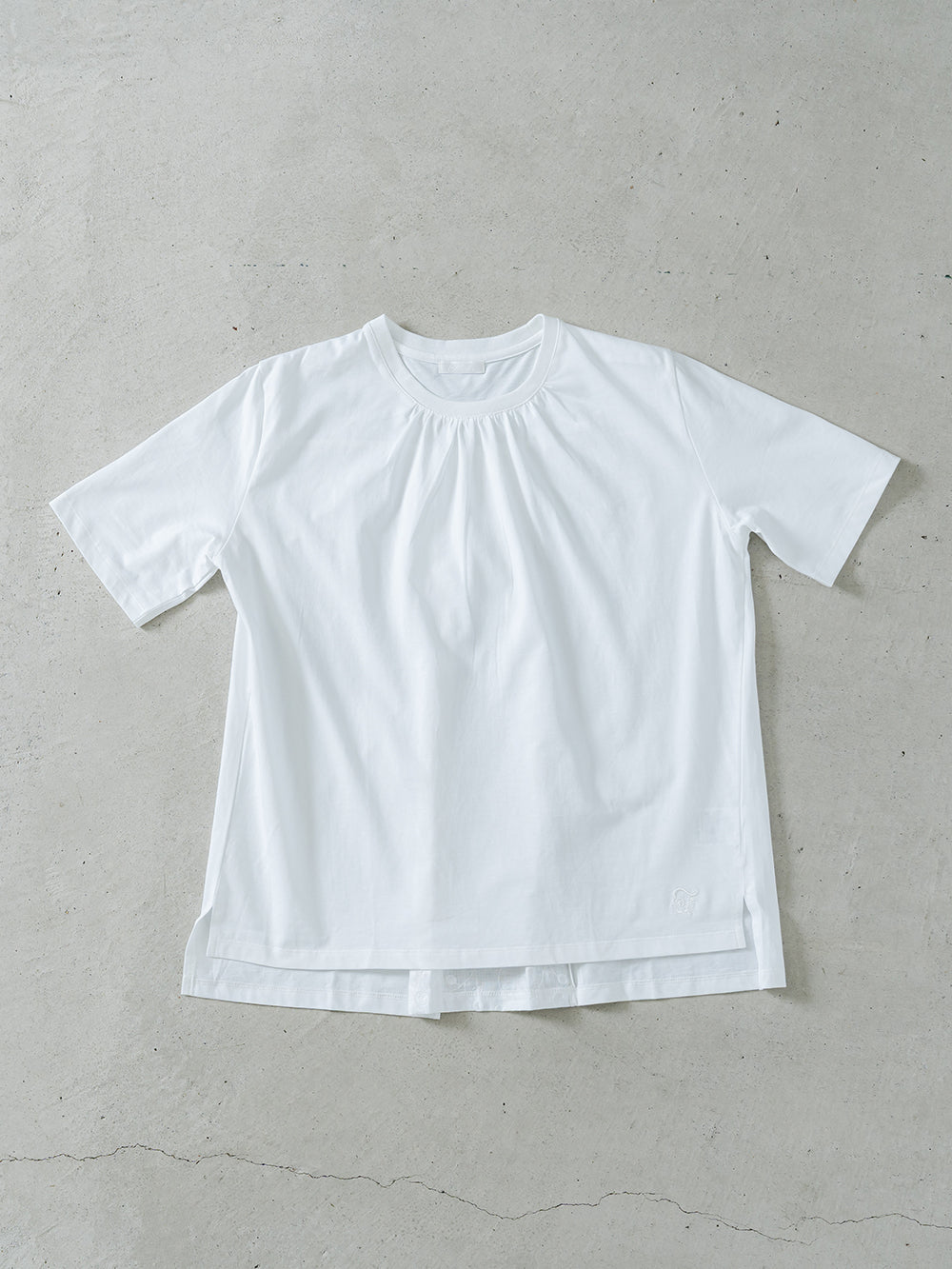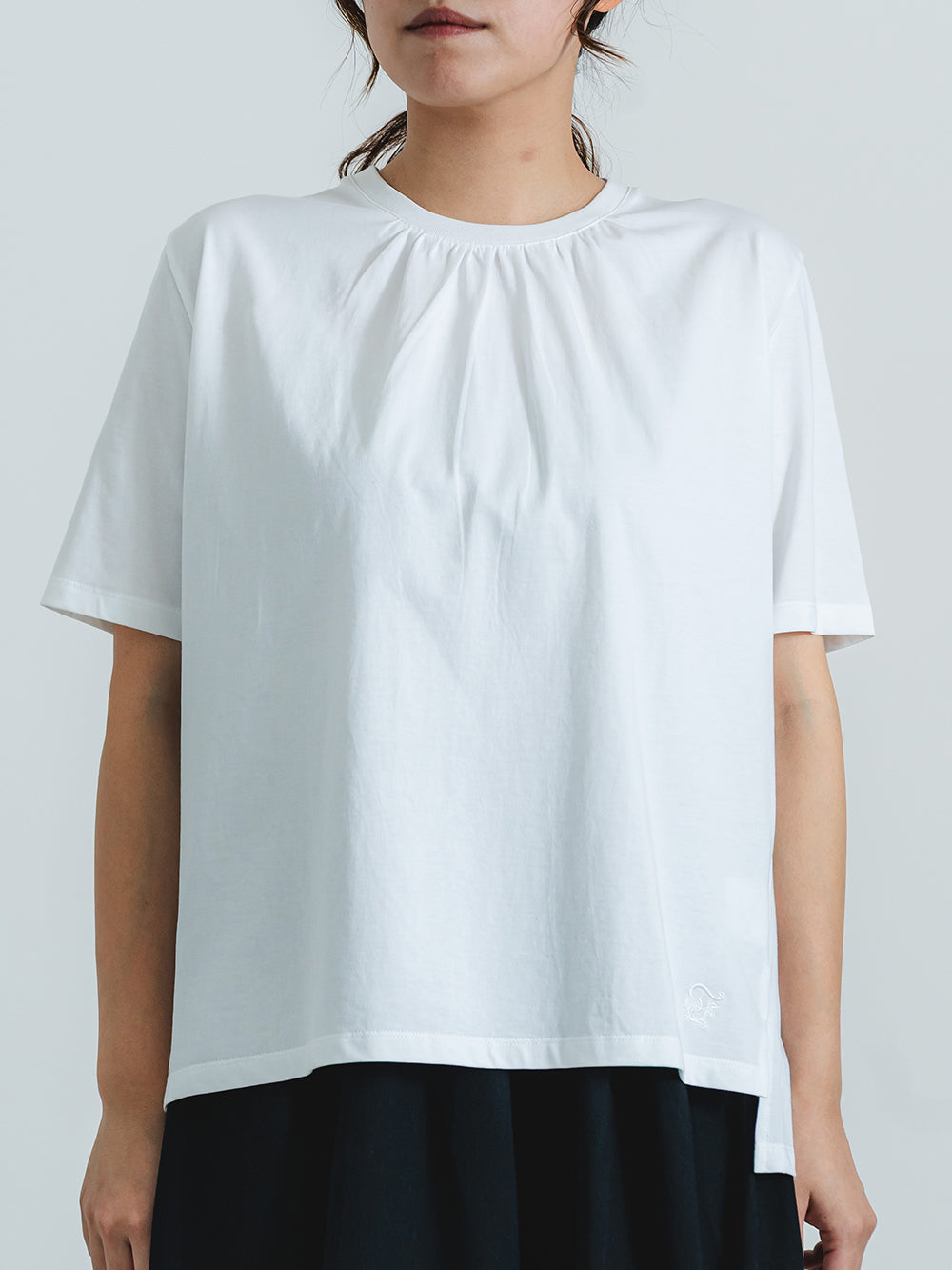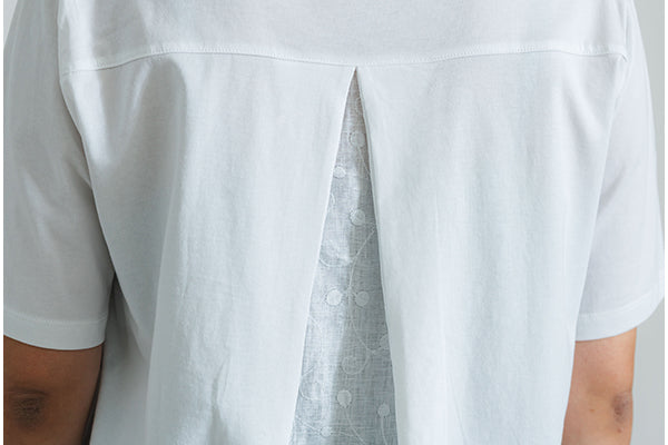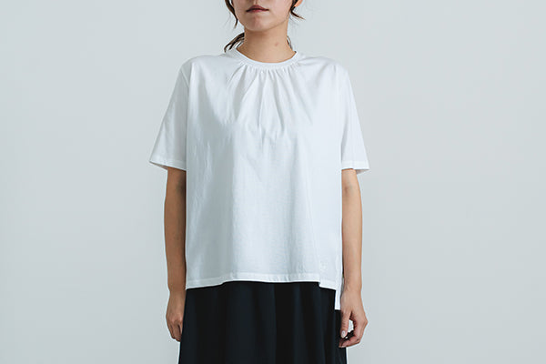 少し長めの丈で、腰周りやヒップ周りをカバー。ペイズリー柄のバックレースプリーツが、シンプルな白にアクセントを持たせます。前身のネックにもギャザーを入れることで、女性らしい可愛らしいデザインに。