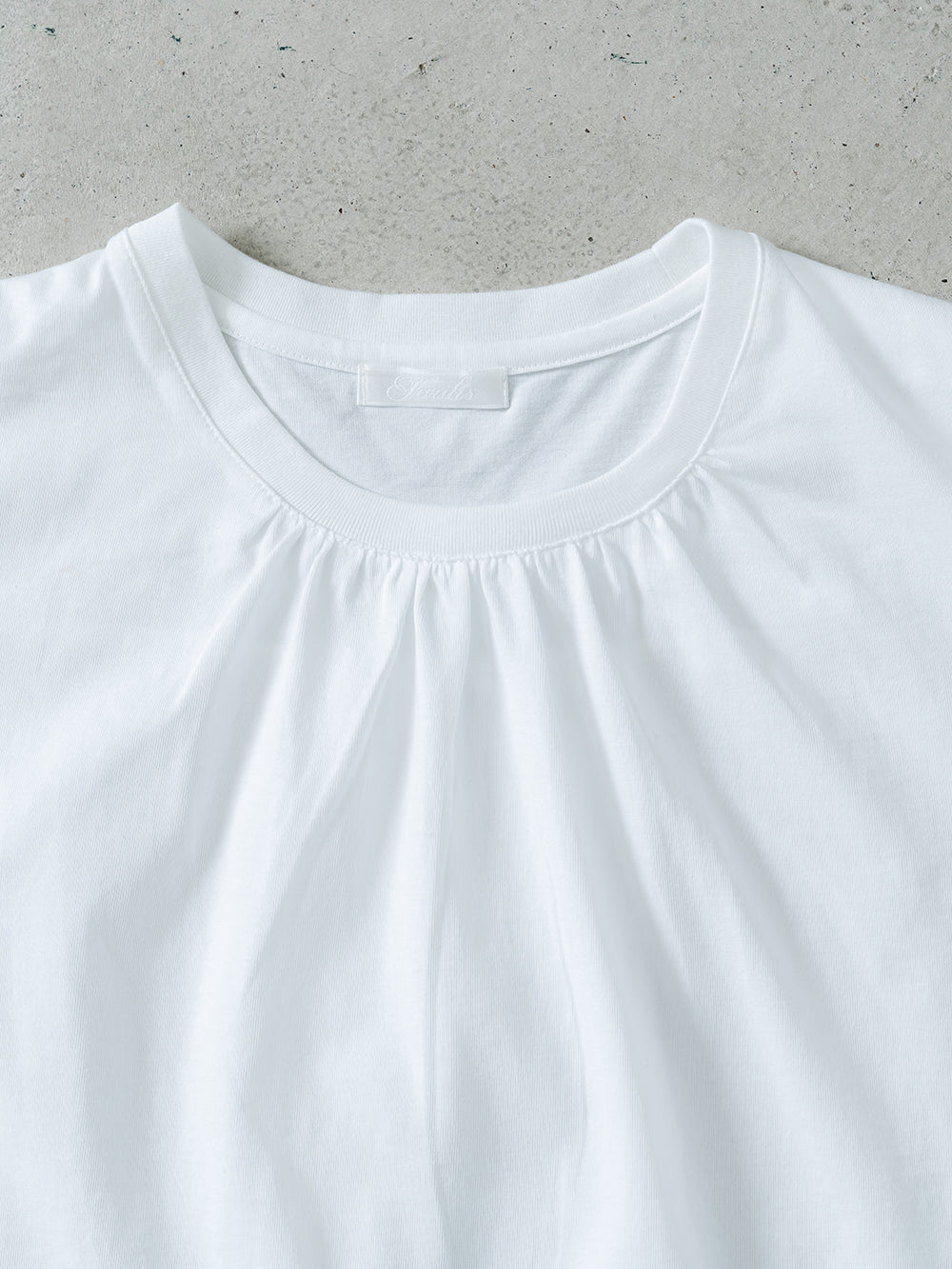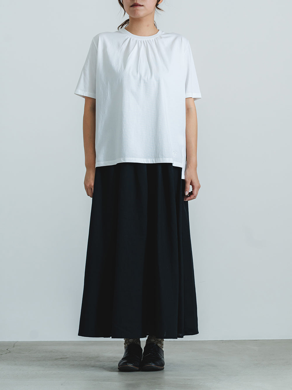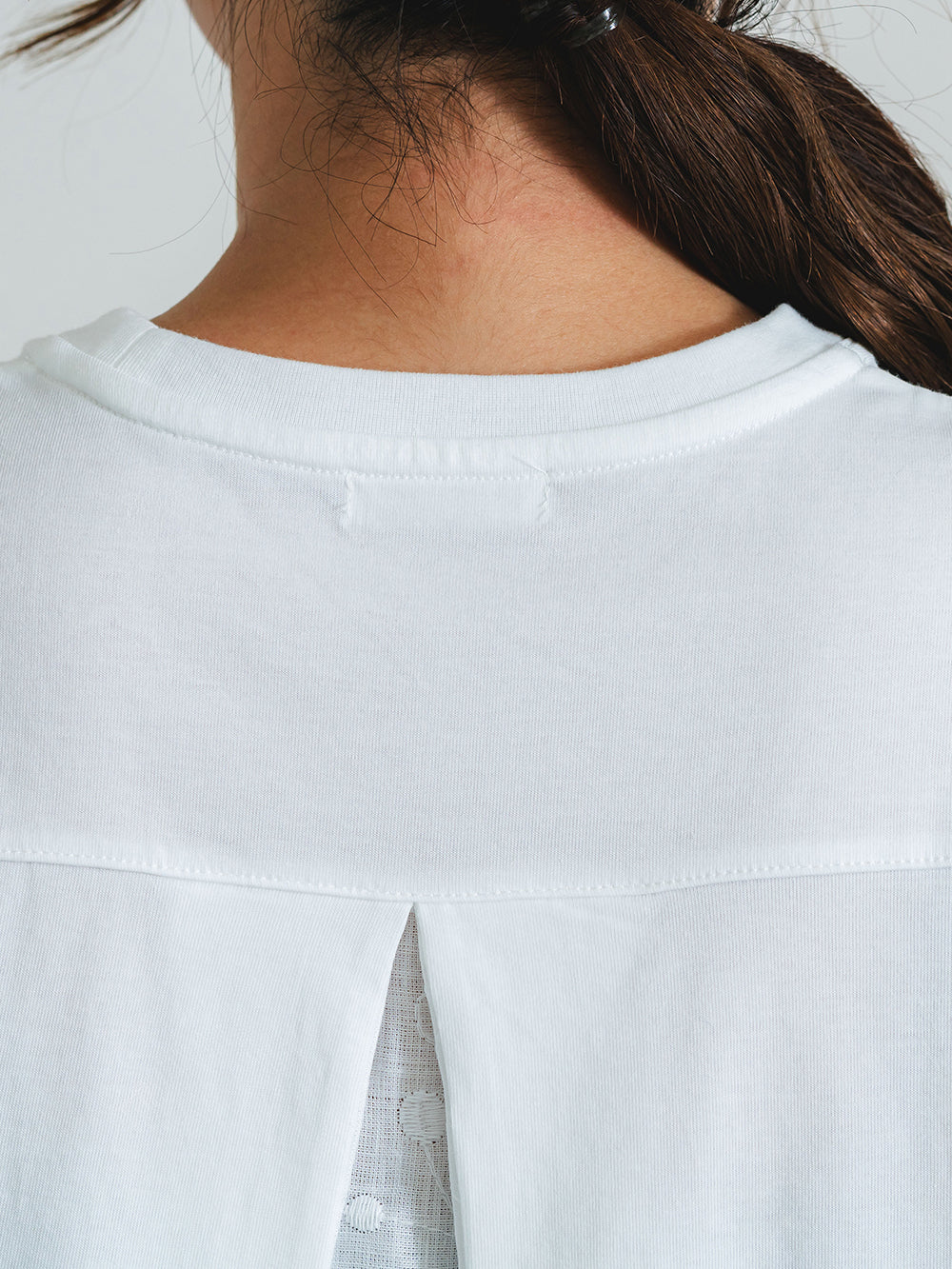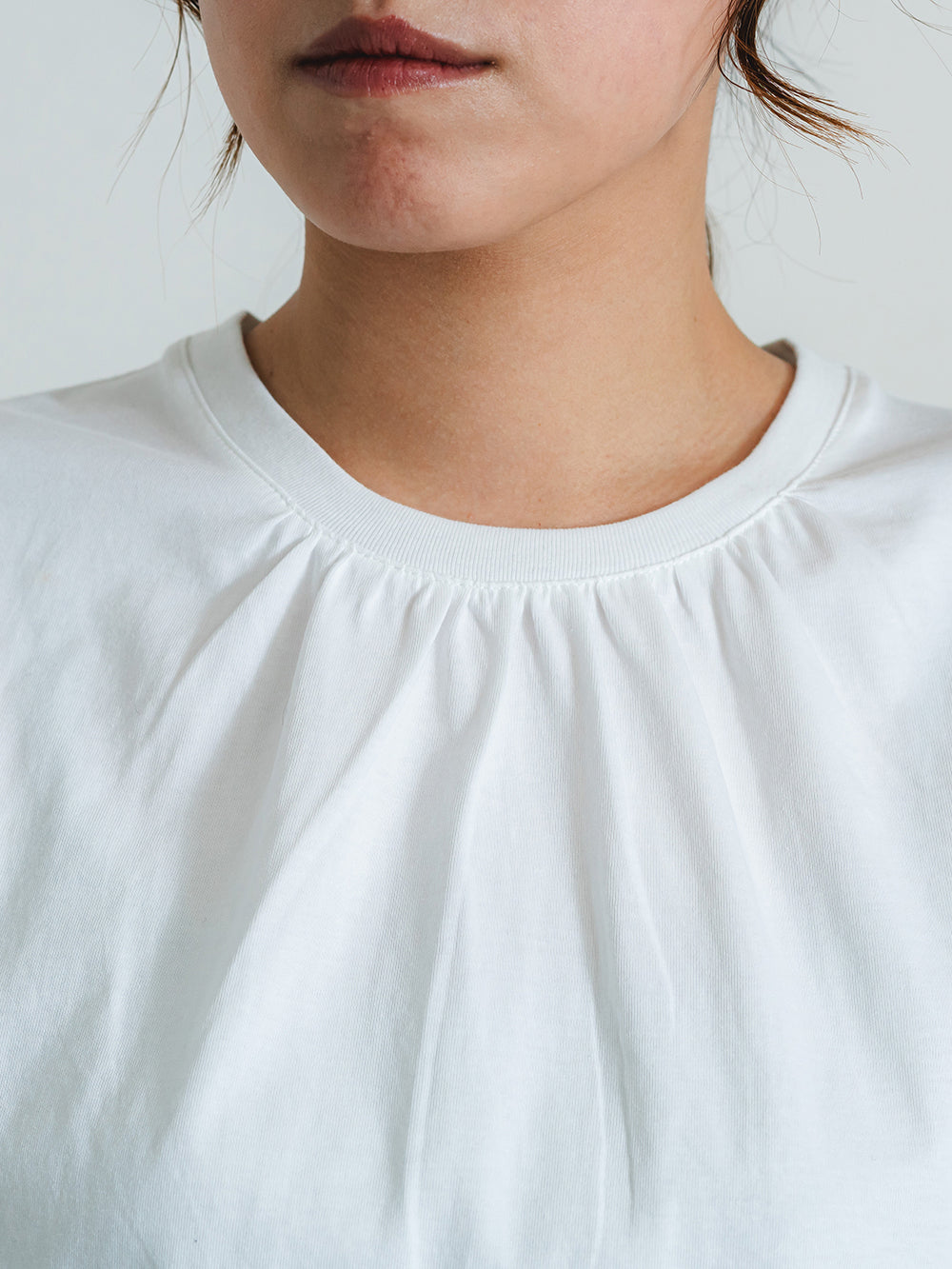 少し長めの丈で、腰周りやヒップ周りをカバー。ペイズリー柄のバックレースプリーツが、シンプルな白にアクセントを持たせます。前身のネックにもギャザーを入れることで、女性らしい可愛らしいデザインに。