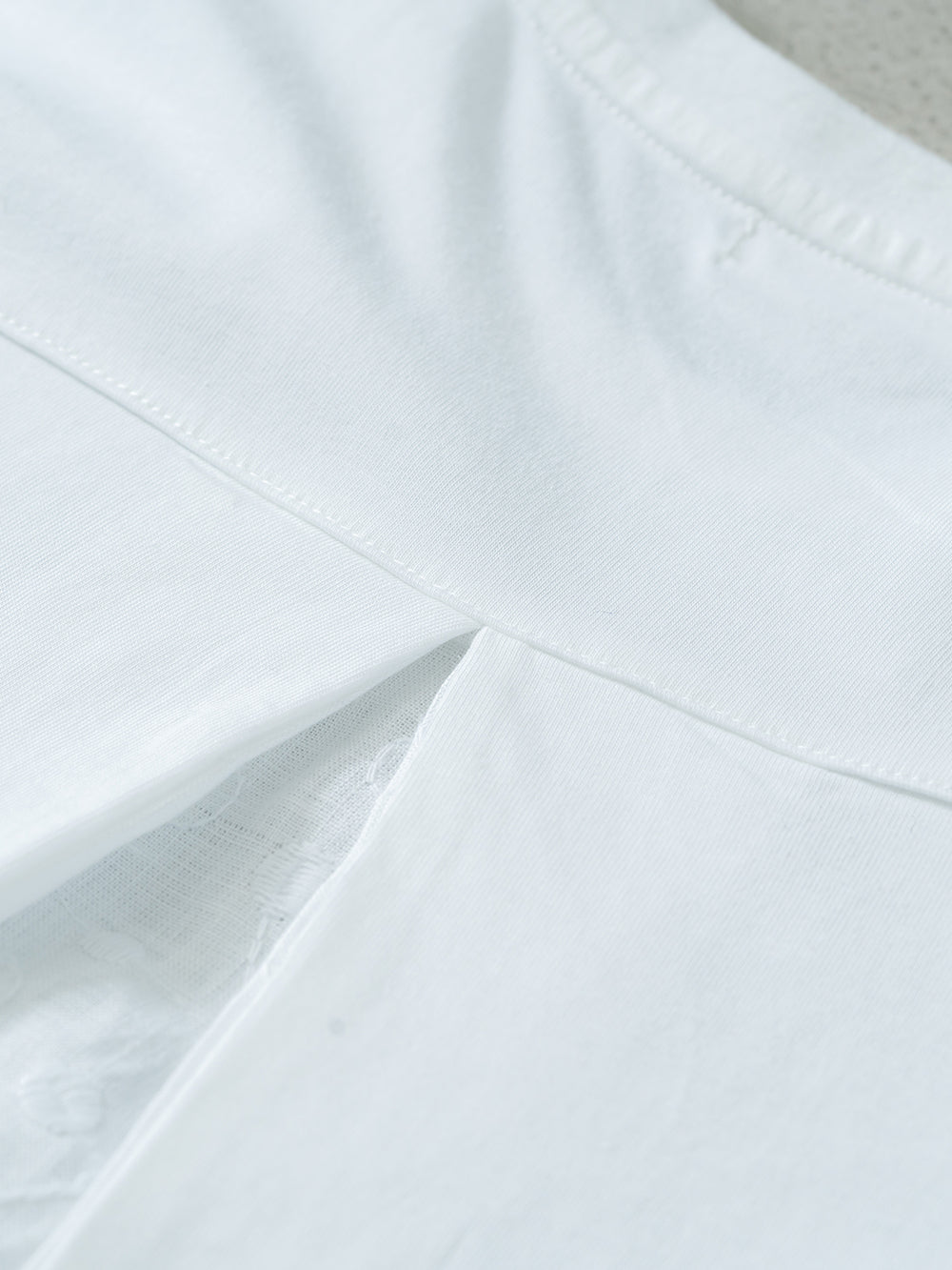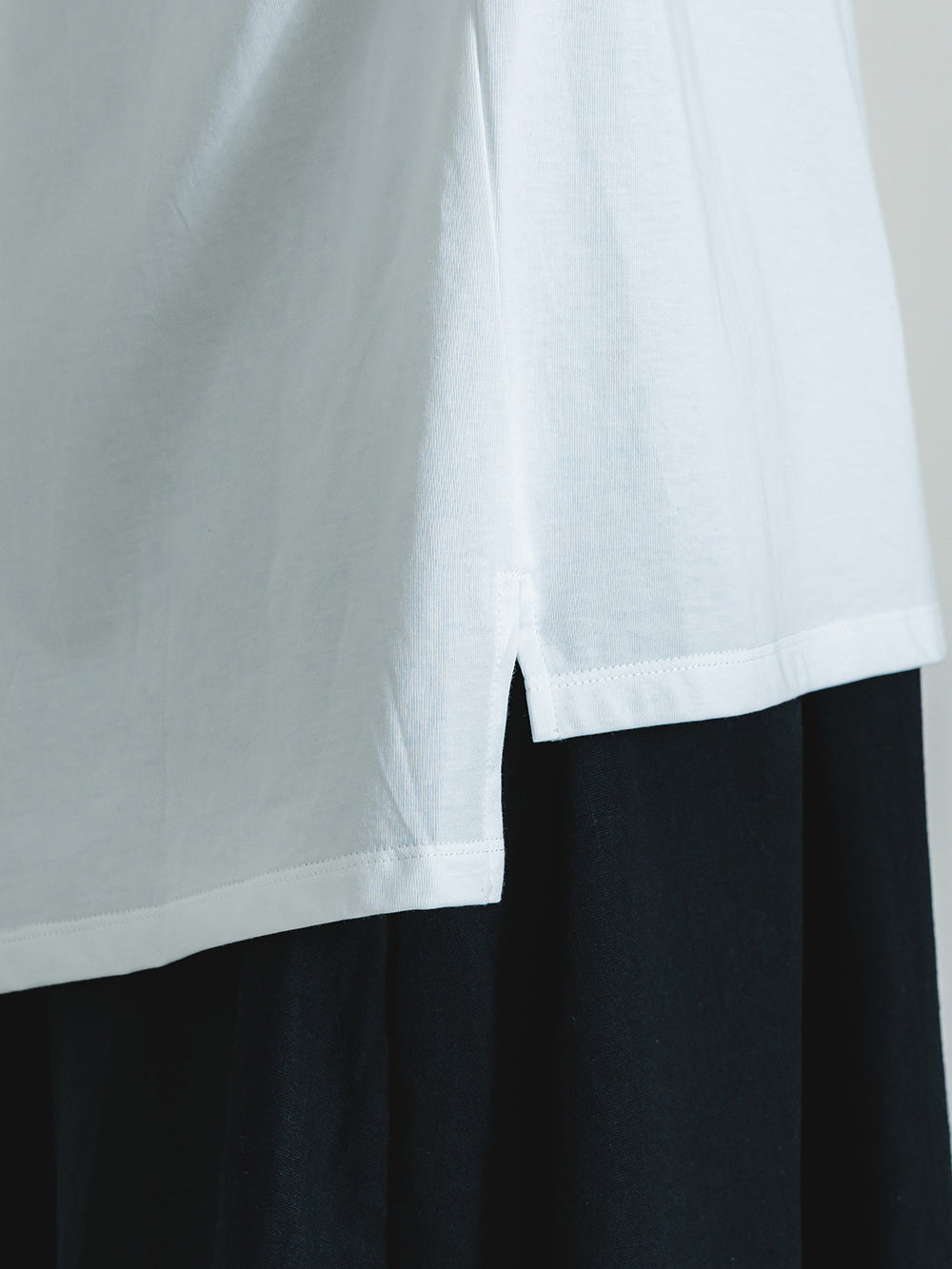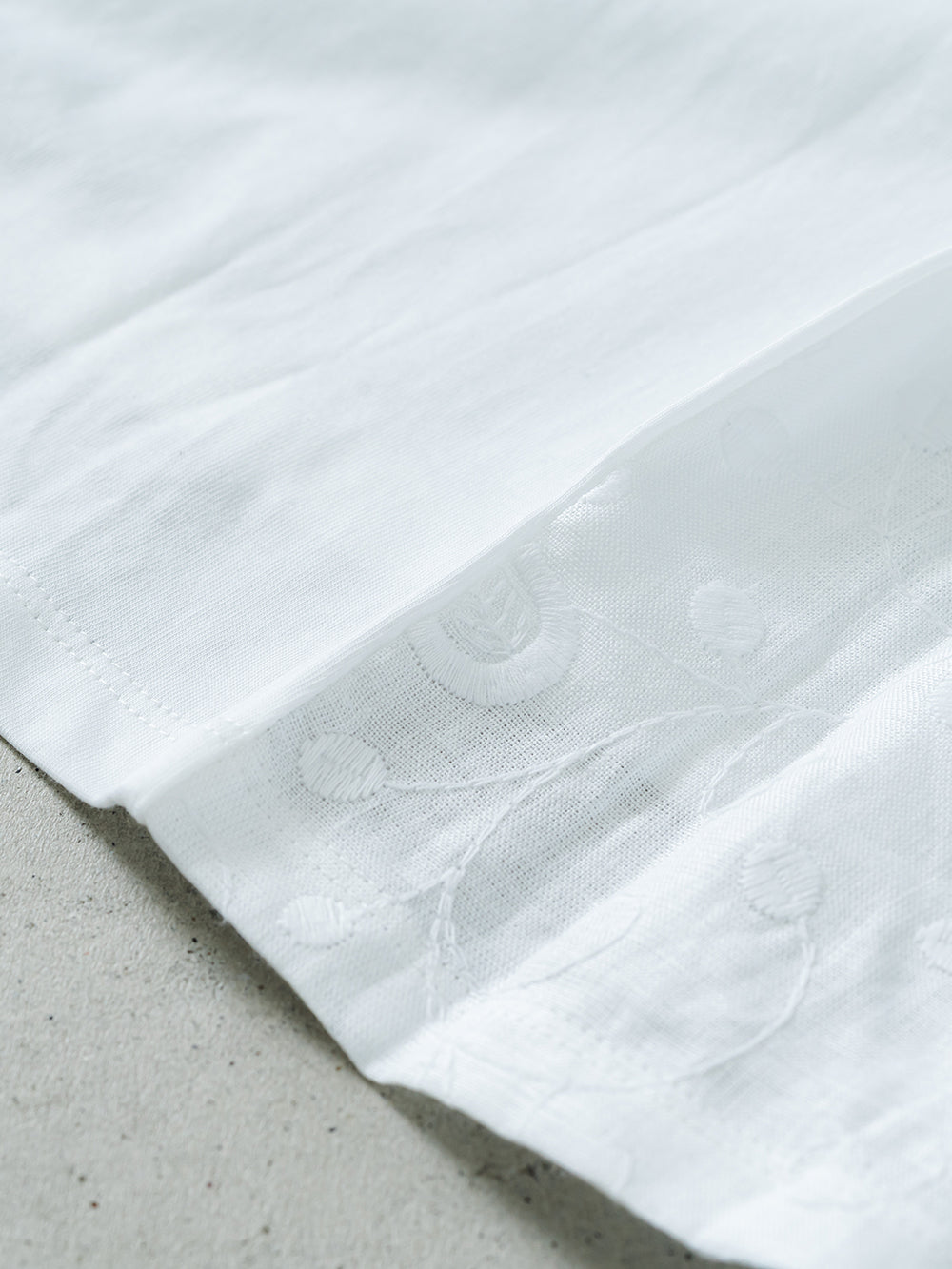 本体はインドの超長綿を47/2番手でサイロ紡績した雪崩式サイトプレミアム天竺を使用。毛羽立ちしにくく、さらっとした生地で洗濯耐久性にも優れています。きれいめでありながらもナチュラルな風合いに仕上げた素材です。レースには麻100%のヘンプ エンブロイダリーを採用。