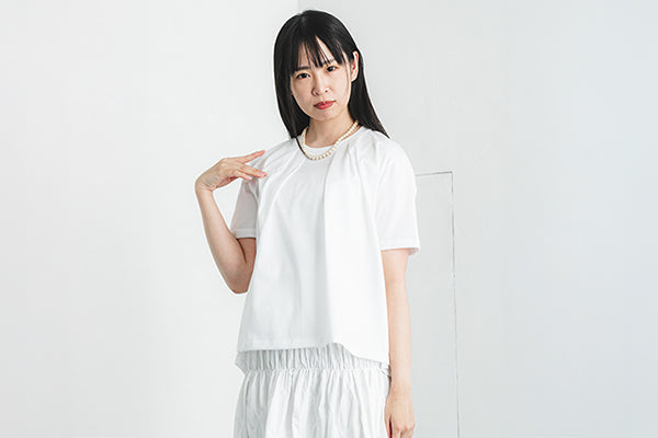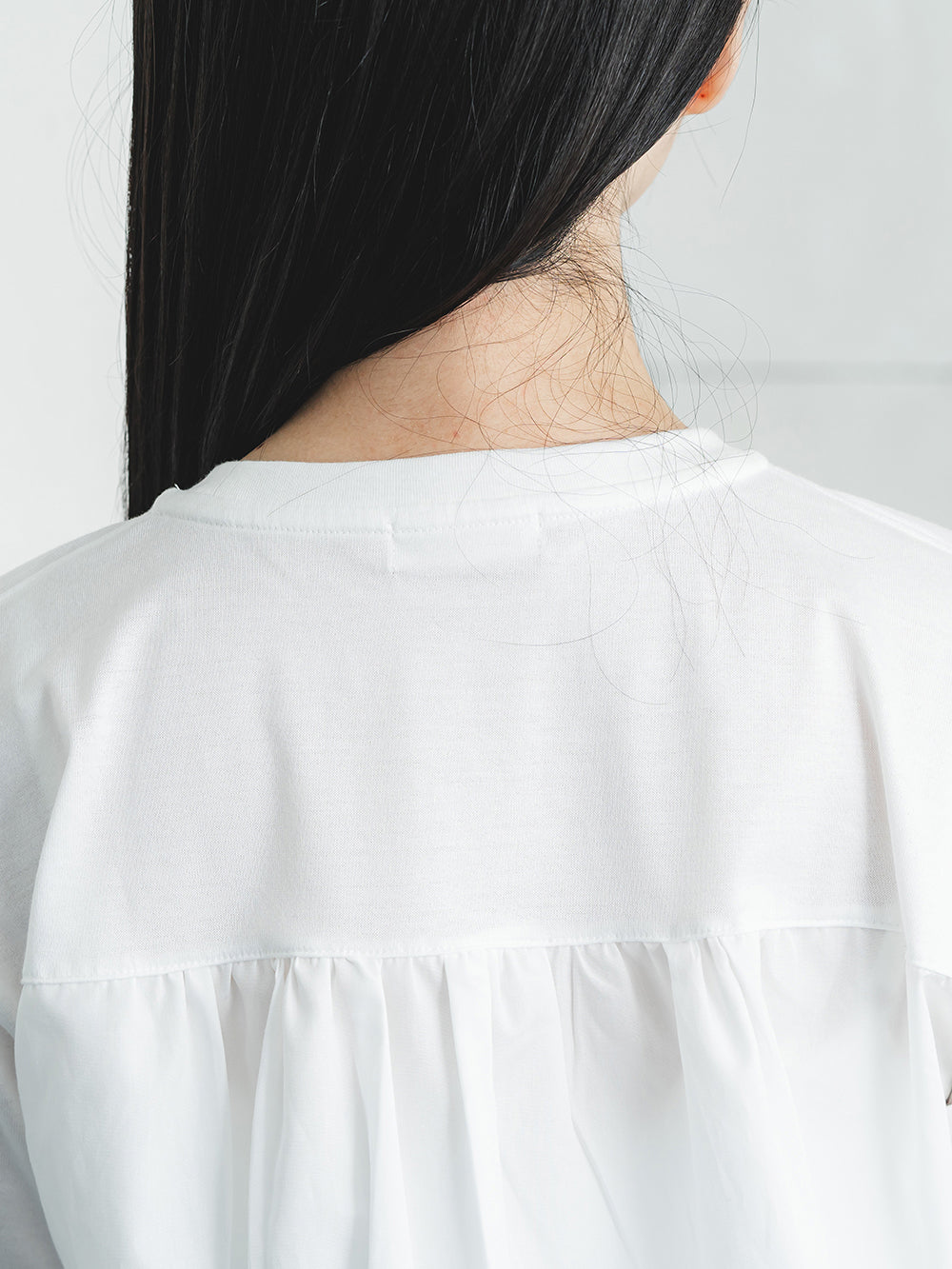 特殊処理により優れた光沢とソフトな風合いを出したCM40/2天竺という、しっかり目の生地を使用。繰り返し洗濯をしても縮みにくく、洗っても型崩れしにくい特性を備えています。UVカット機能もある、肌に優しい生地です。後身に使われている別布は、布帛素材のコーマブロードを採用。光沢に優れた糸を使用した高級感のある素材で、前身とのバランスが取れています。