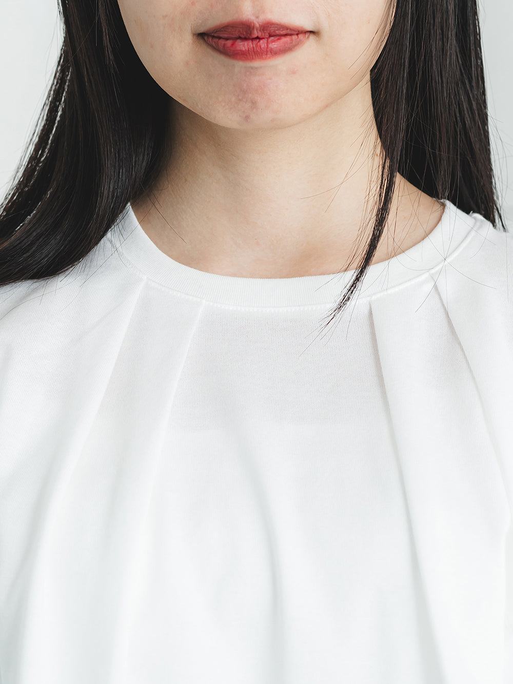 前身には深めのタックプリーツを4本、後身には20cm幅に細やかなギャザーを入れ、裾にかけてフレアを出したデザイン。立体感のある美しいシルエットを実現しています。