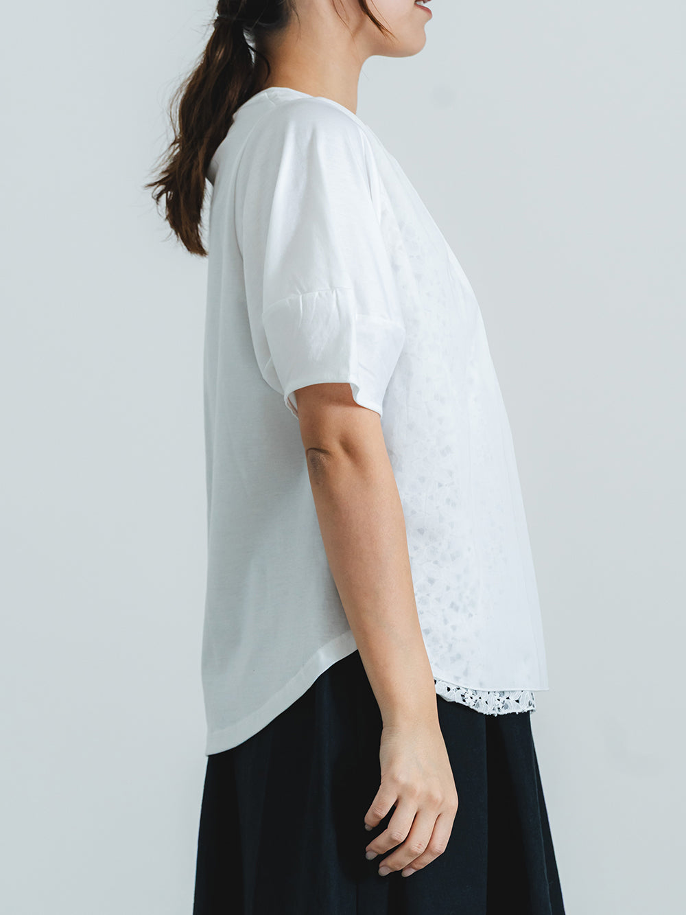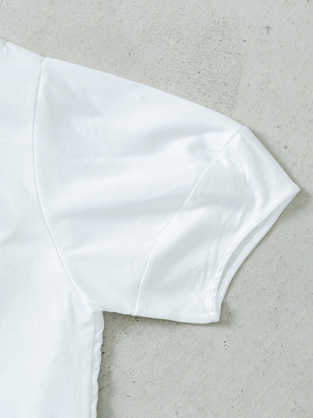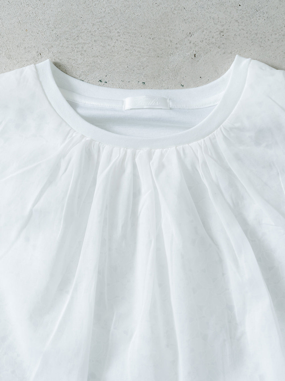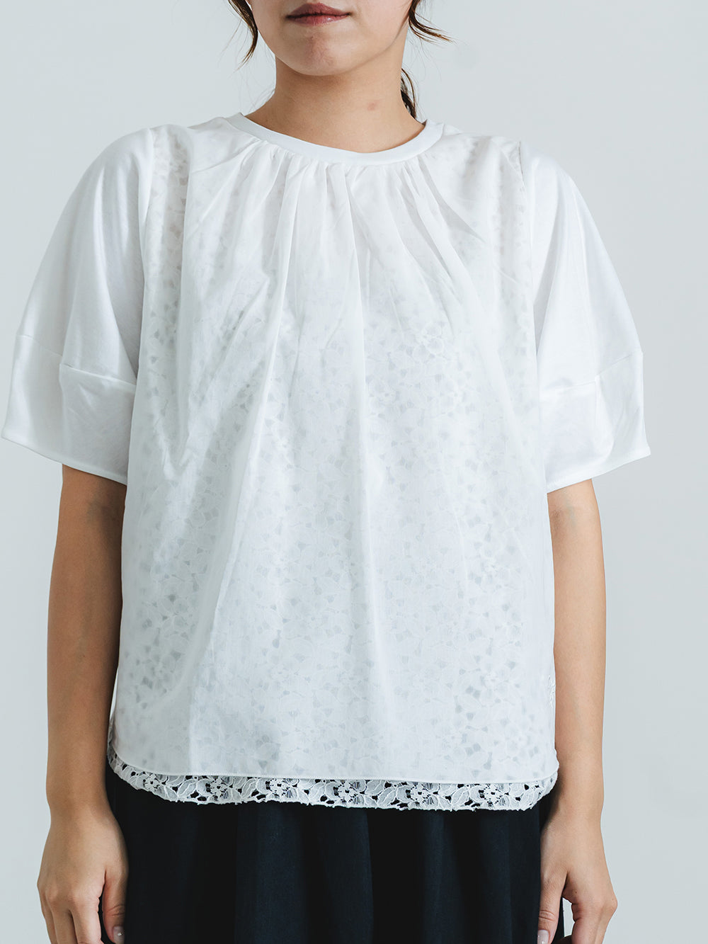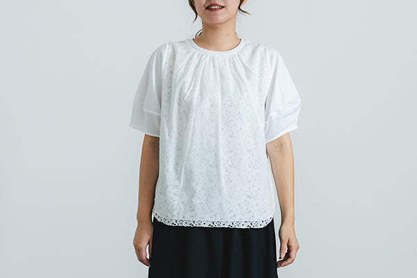 一見シンプルな白Tに見えますが、光の具合によってレースの透け感が変わる魅力的なデザイン。パフスリーブタイプの袖が丸みを出し、柔らかく可愛らしい印象を添えます。気になる二の腕もさりげなくカバーします。