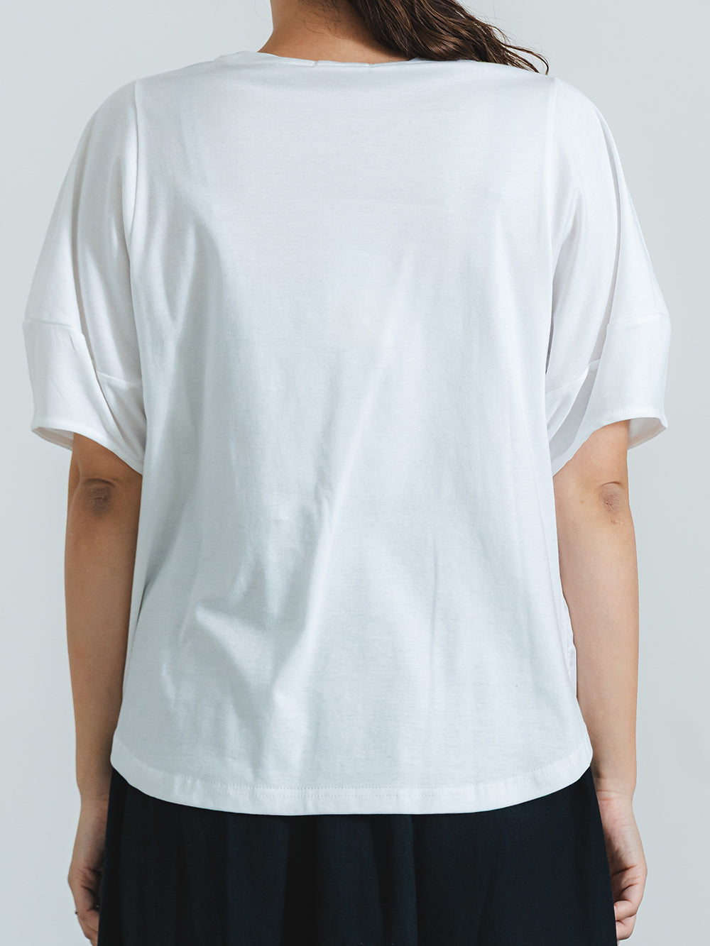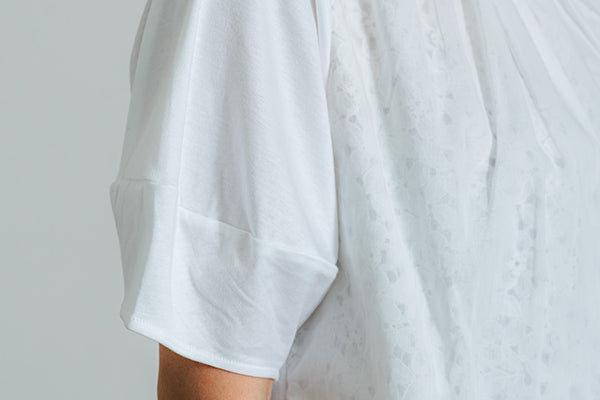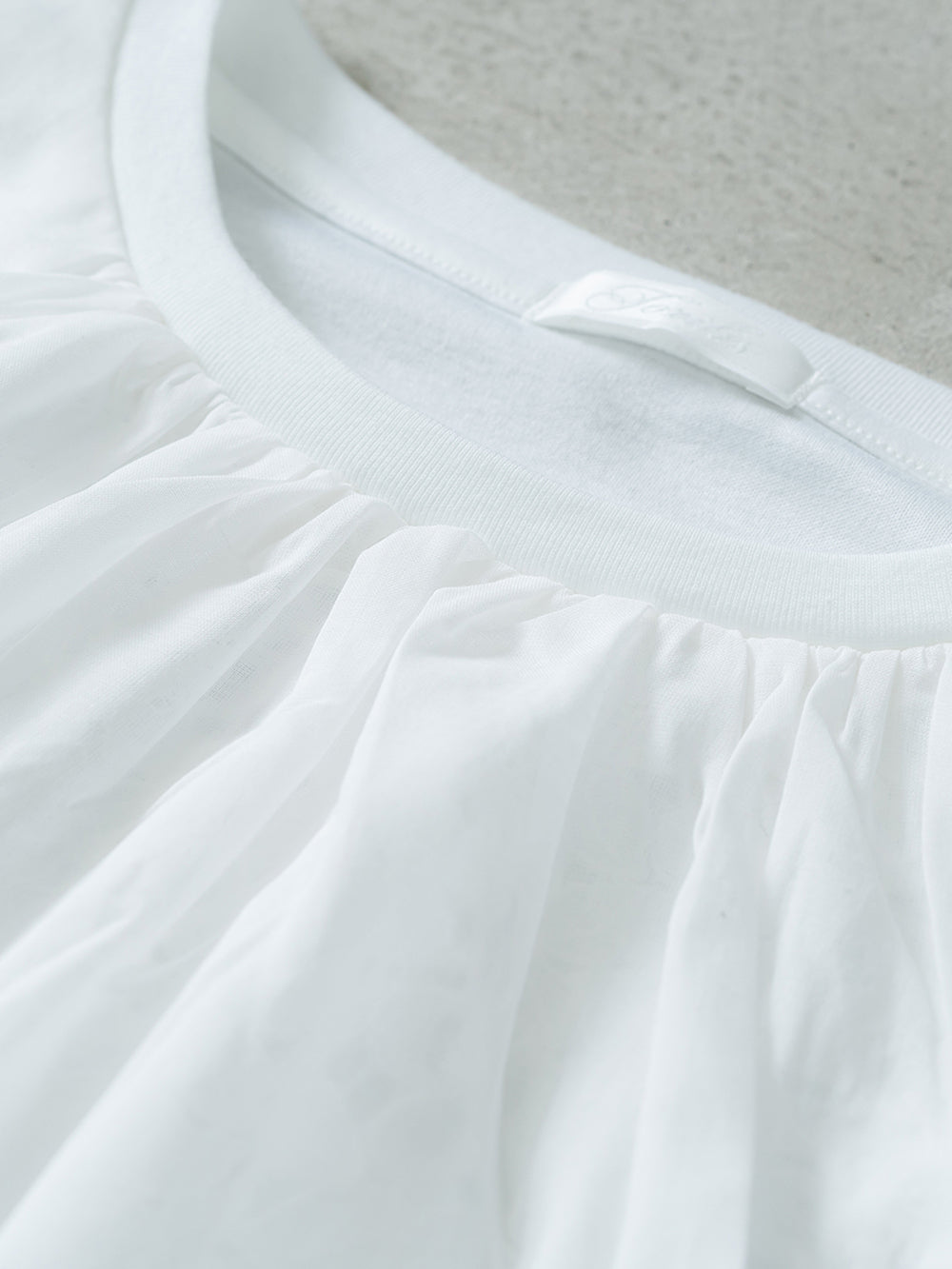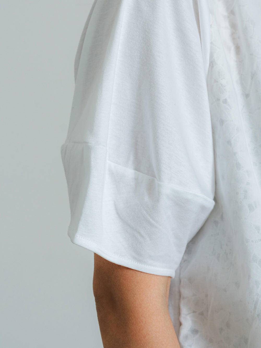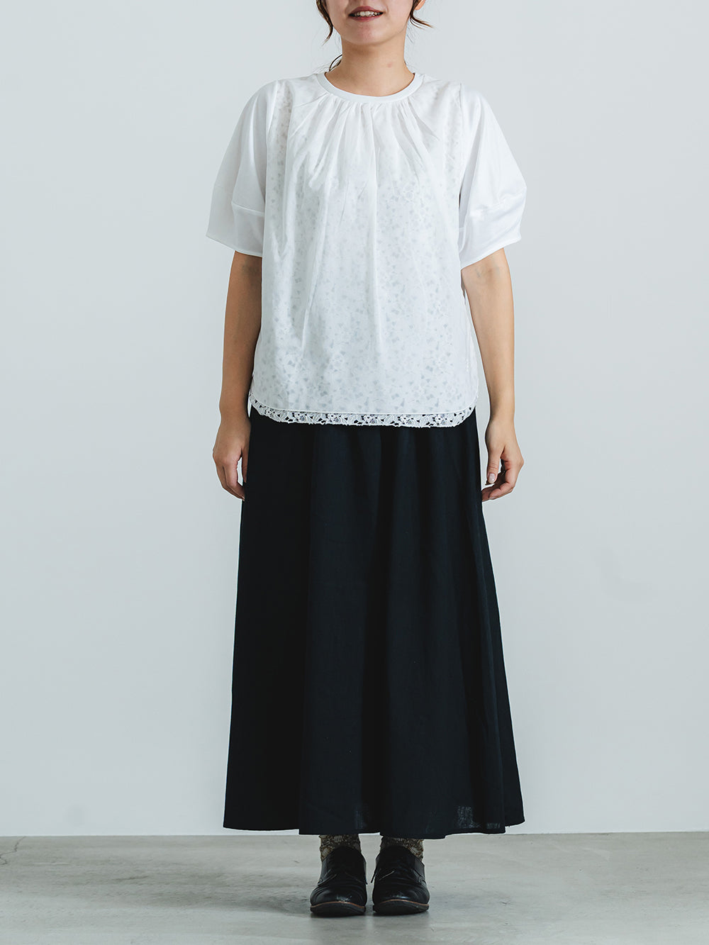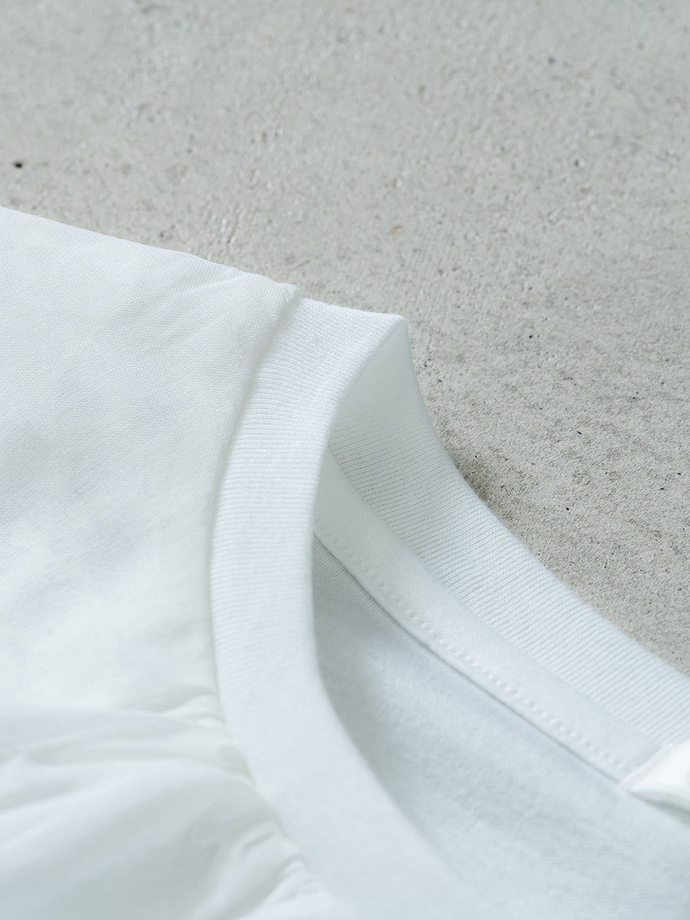 一見シンプルな白Tに見えますが、光の具合によってレースの透け感が変わる魅力的なデザイン。パフスリーブタイプの袖が丸みを出し、柔らかく可愛らしい印象を添えます。気になる二の腕もさりげなくカバーします。