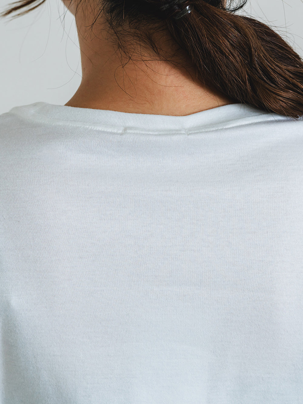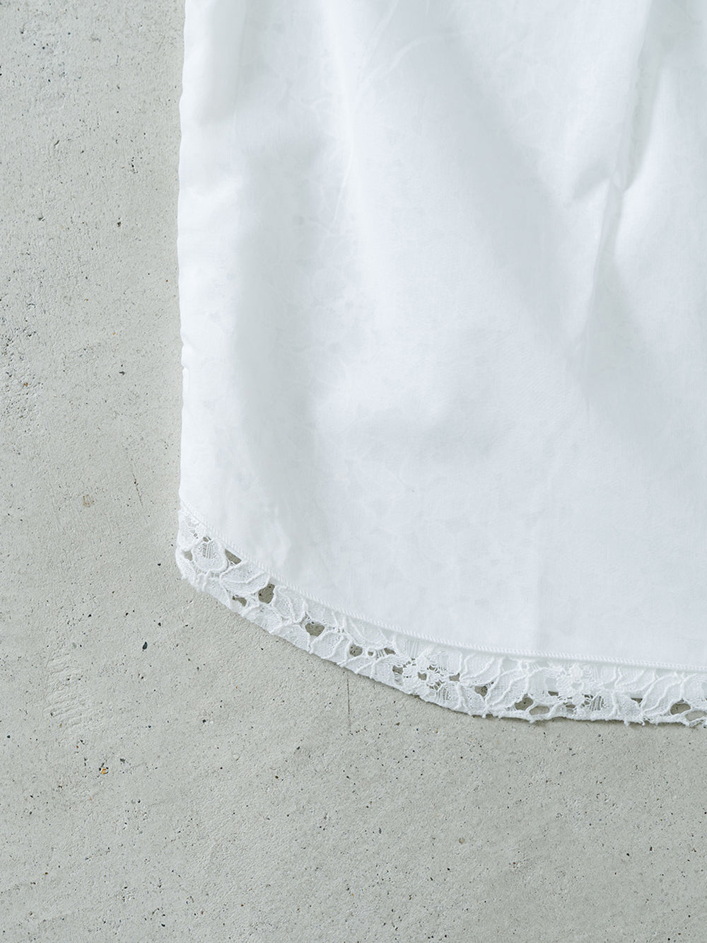 前身は極薄のボイル生地の下にレースがあり、インナーが透けにくく清涼感を実現。後身は上質なスーピマ超長綿を使用し、コンパクトヤーン仕上げにすることで毛羽が少なく綺麗な生地感に。さらに光沢を出す加工を施し、ソフトな風合いに仕上げました。