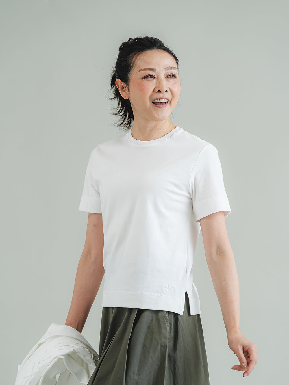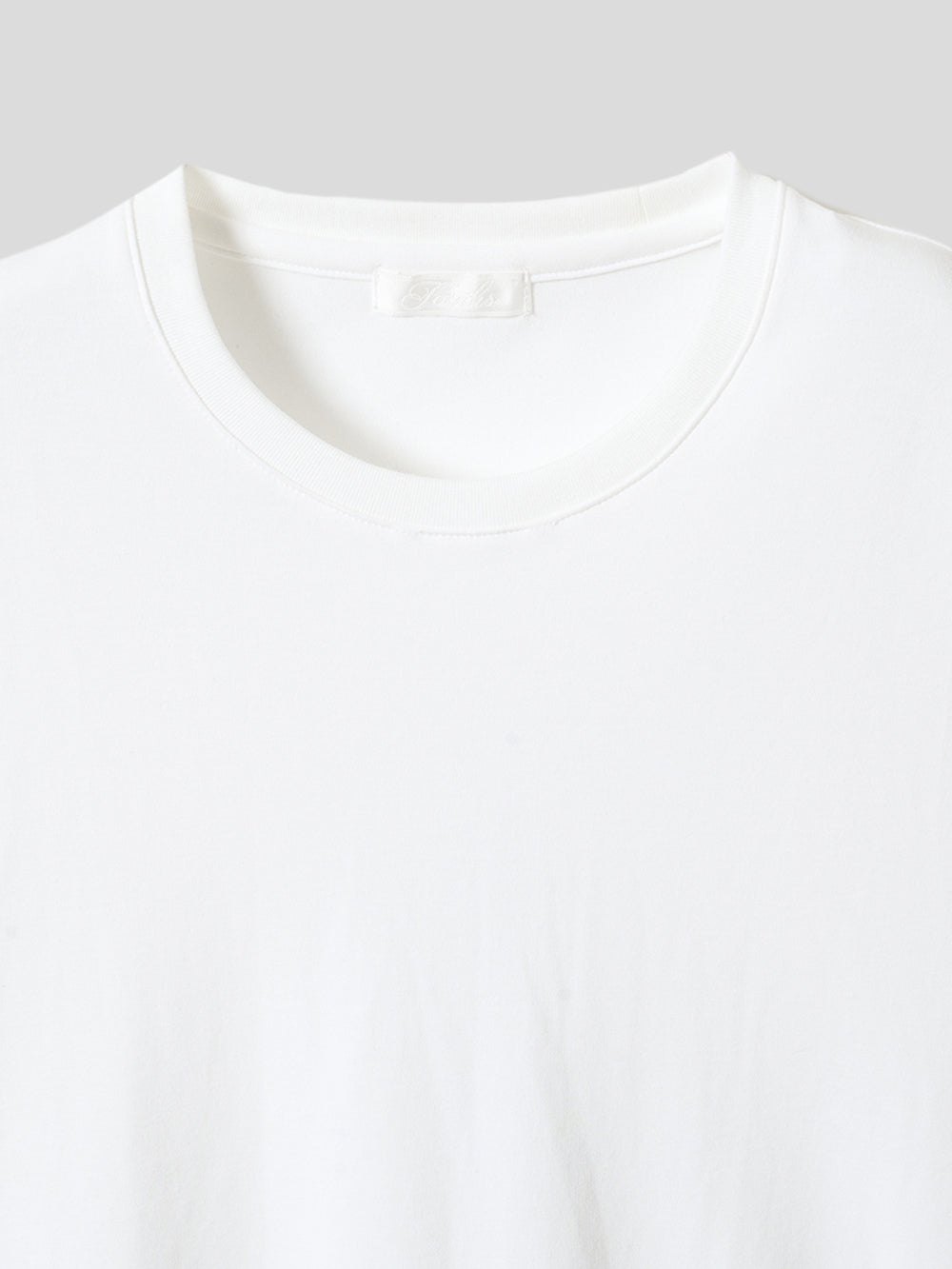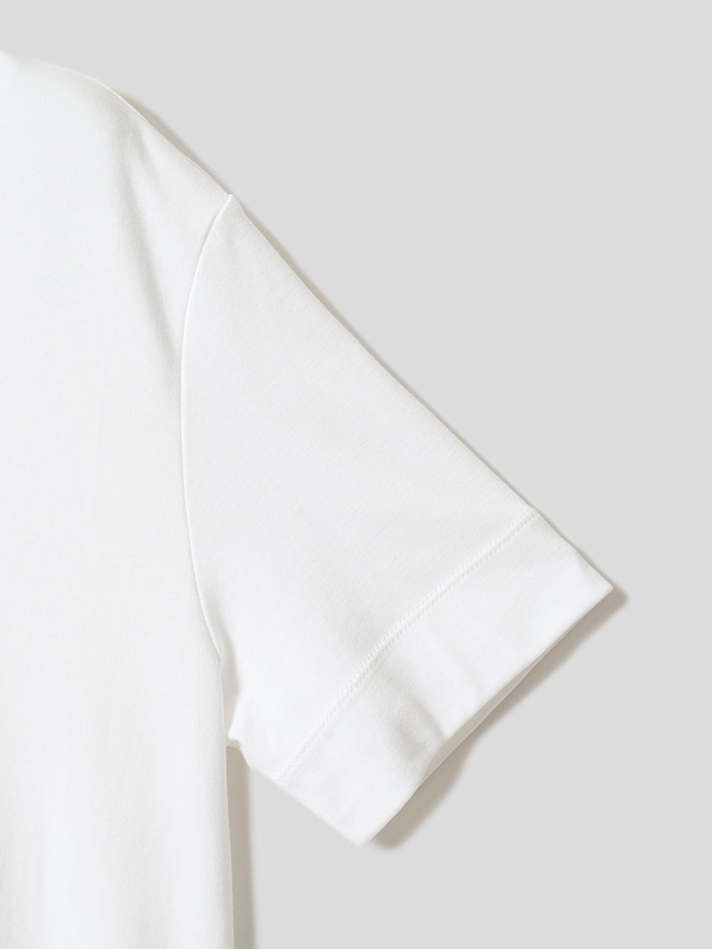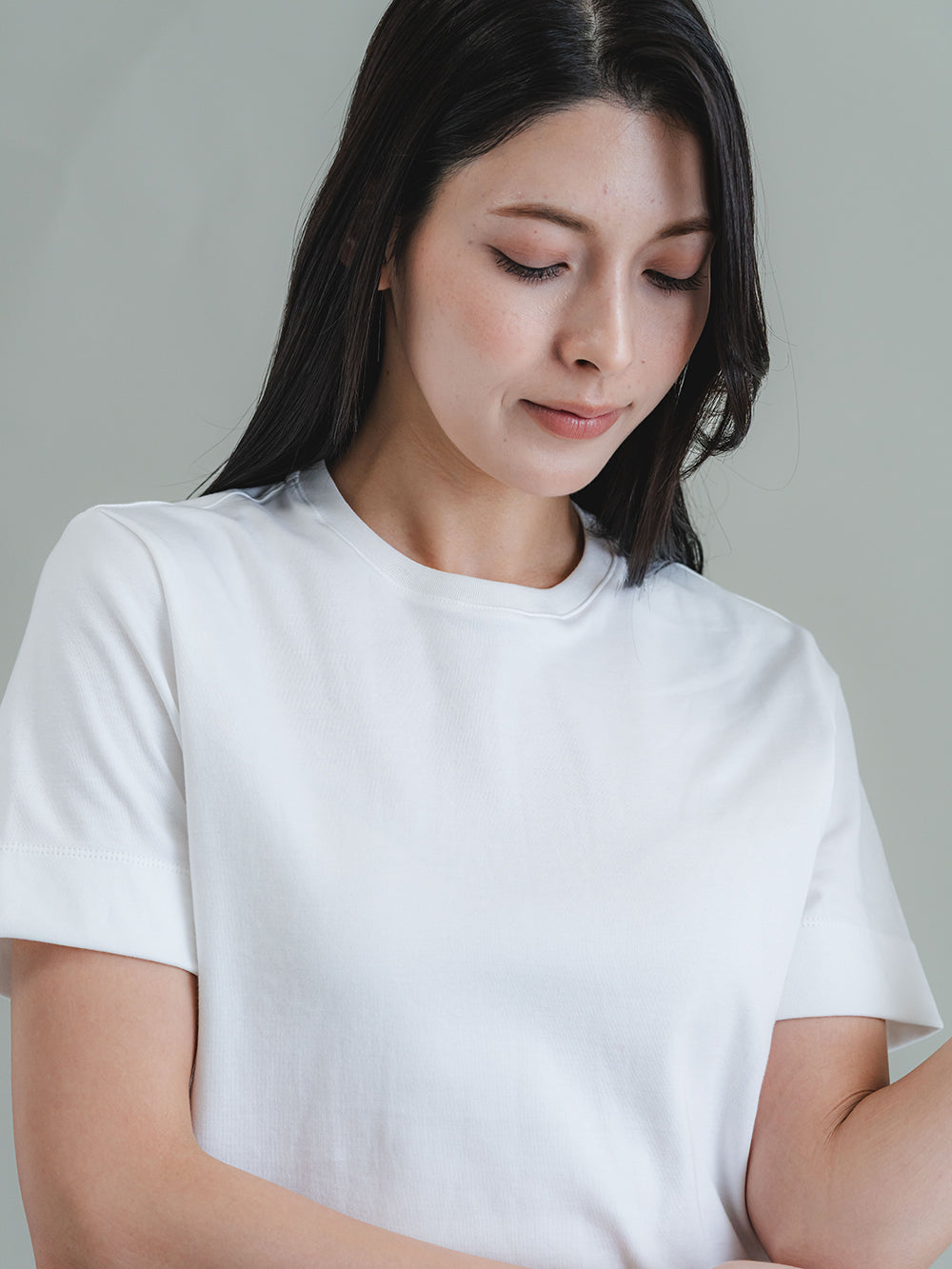 幻のコットンと言われるシーアイランドコットンとインド原産のスジャータ綿を掛け合わせたスビンコットン。その最高峰、ファーストピック(初摘み)のみが名乗れる「スビンプラチナム」を使用。やわらかく、なめらかな着心地のスムース編み生地です。