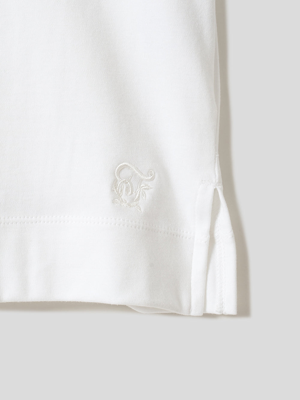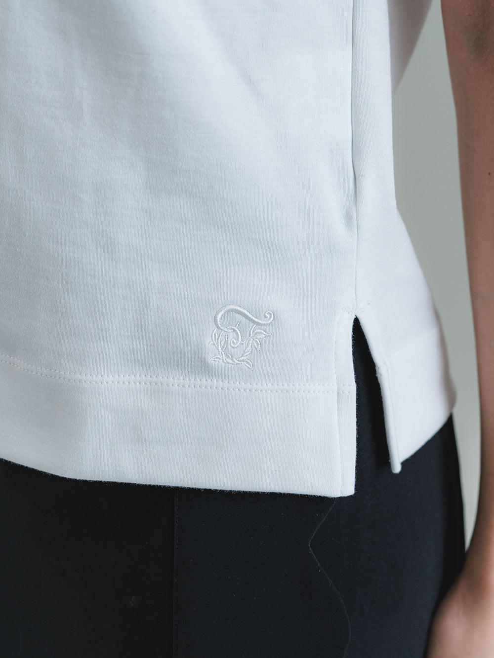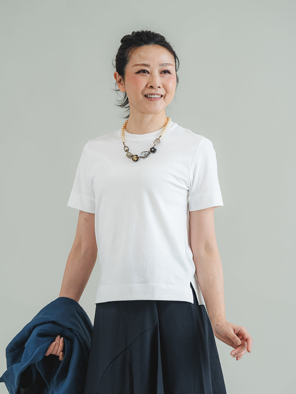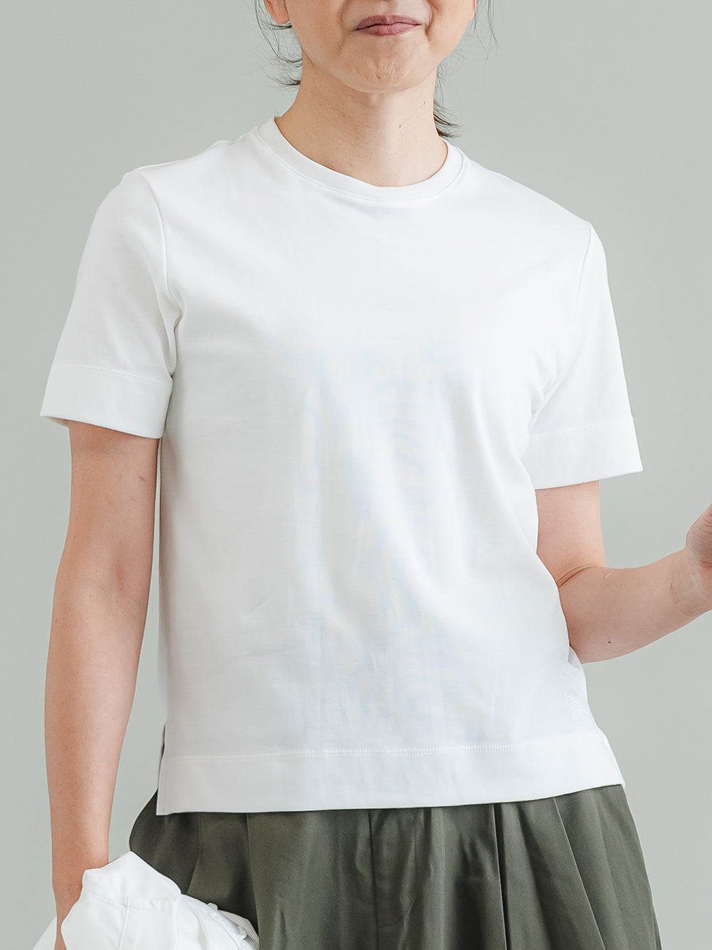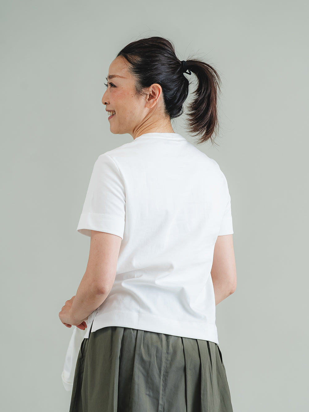 幻のコットンと言われるシーアイランドコットンとインド原産のスジャータ綿を掛け合わせたスビンコットン。その最高峰、ファーストピック(初摘み)のみが名乗れる「スビンプラチナム」を使用。やわらかく、なめらかな着心地のスムース編み生地です。