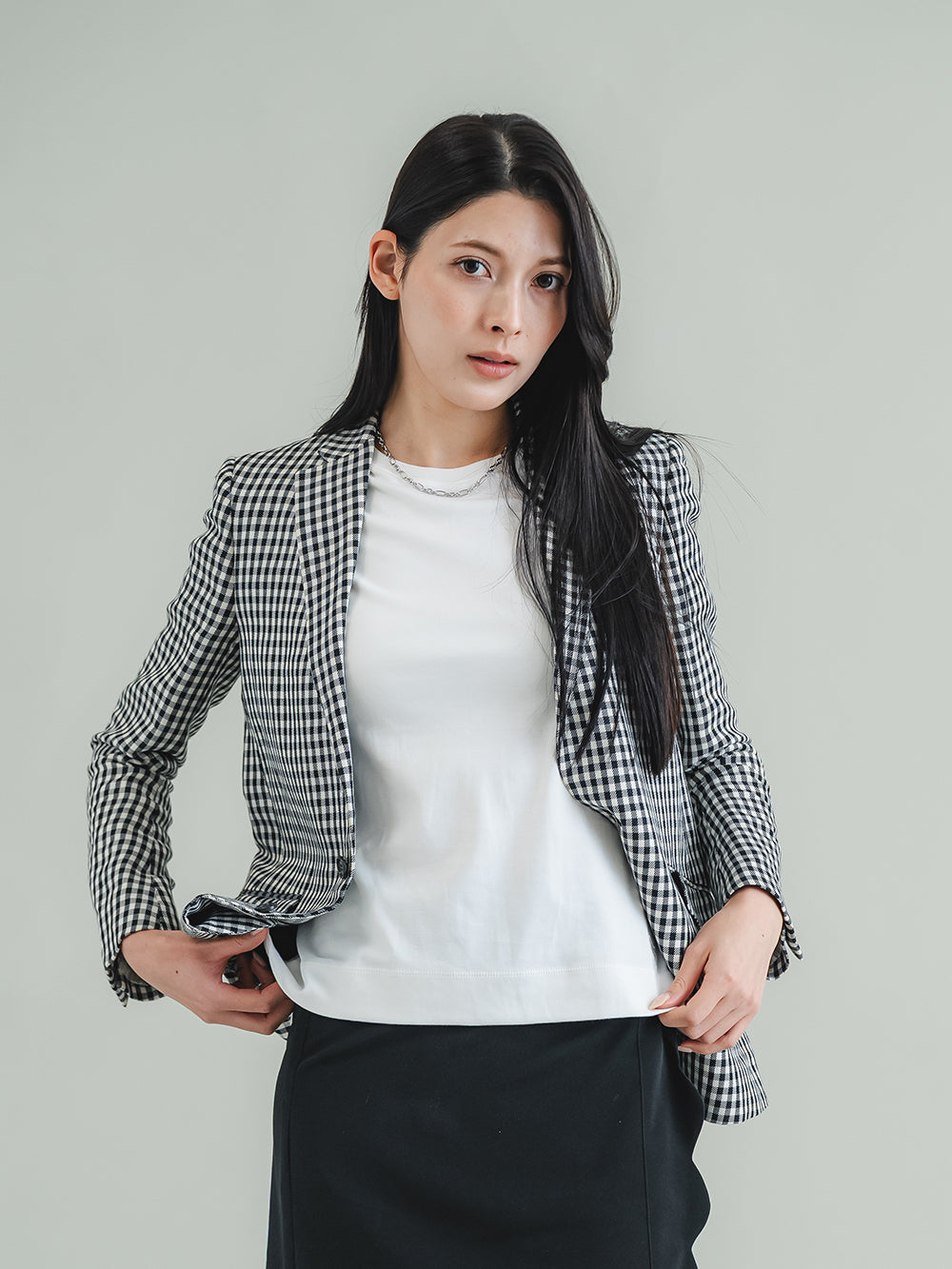 やや細めの衿とほどよく体のラインに沿うデザインが、洗練されたドレッシーな印象に。少し長めの袖丈は、ビジネスシーンやフォーマルな場面に最適です。