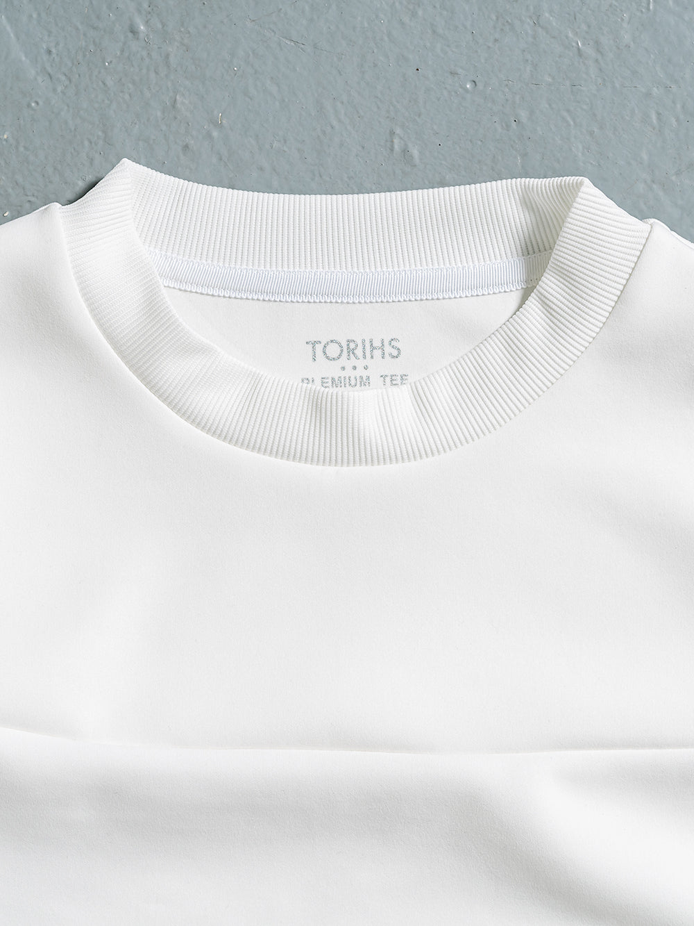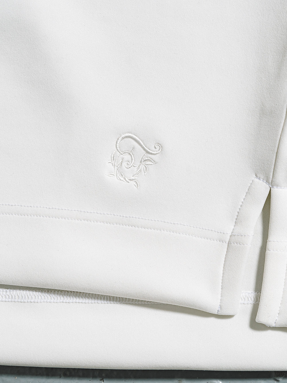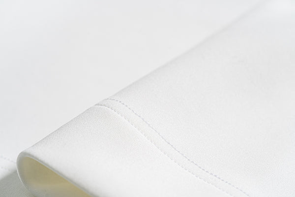 表面と裏面を中糸でつなぎ合わせた、ダンボールに近い構造のニット生地を使用。程良いハリ感と光沢感があり、シワになりにくい特徴があります。裏側には抗菌繊維を使用し、抗菌効果・速乾・接触冷感・UVカットを兼ね備えた肌に優しい素材です。ネックとリブには艶やかなストレッチジャージーを採用し、フォーマル感と着やすさを両立しています。