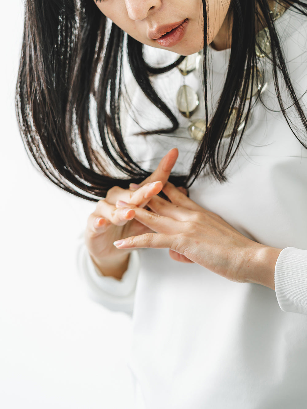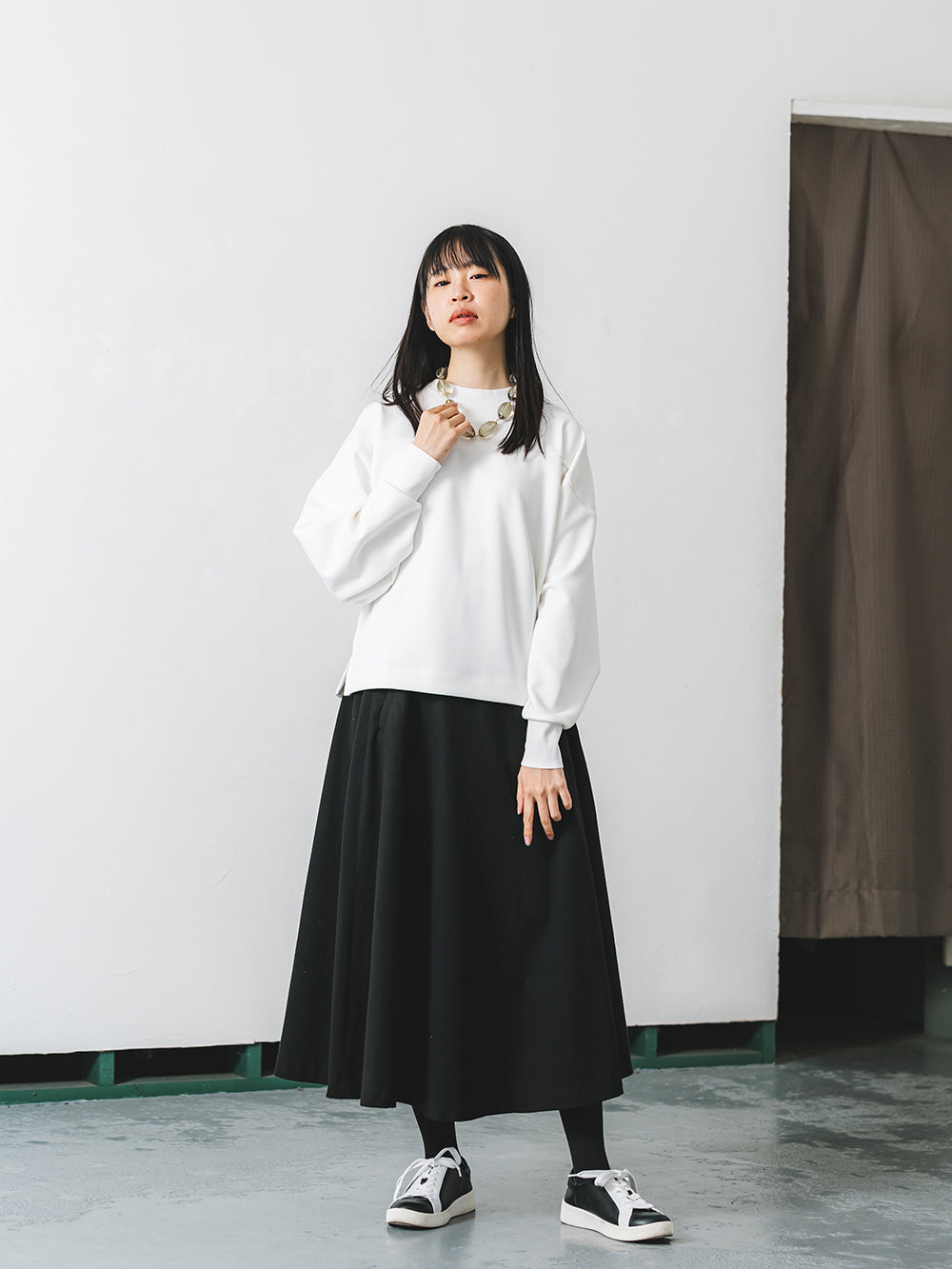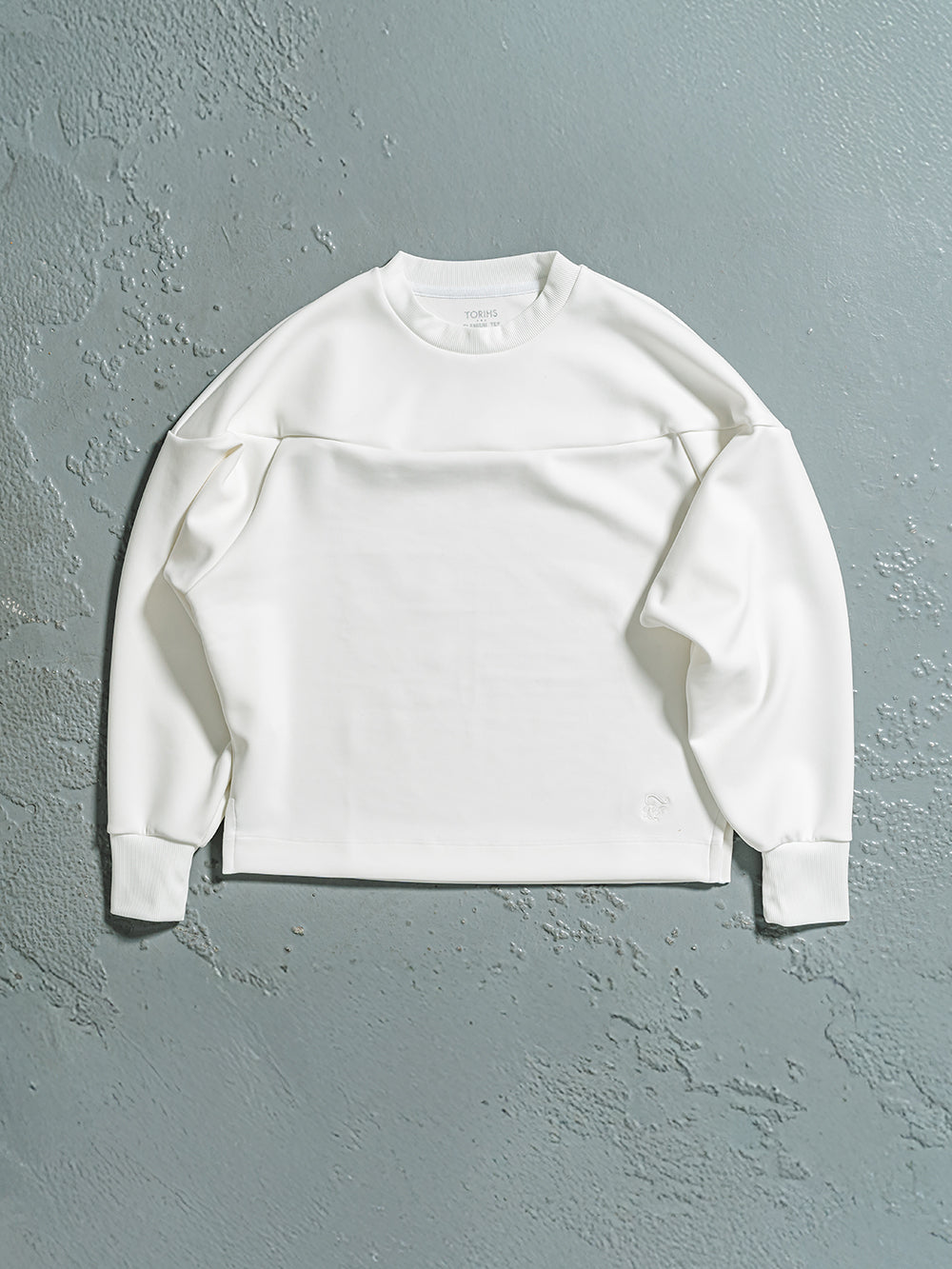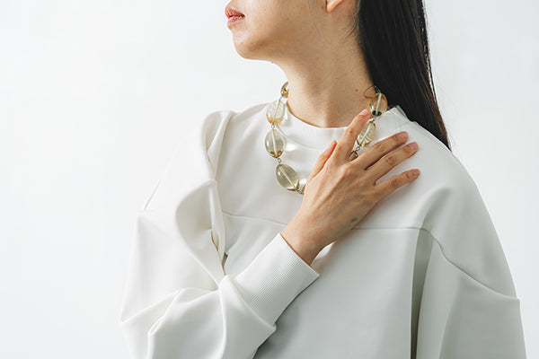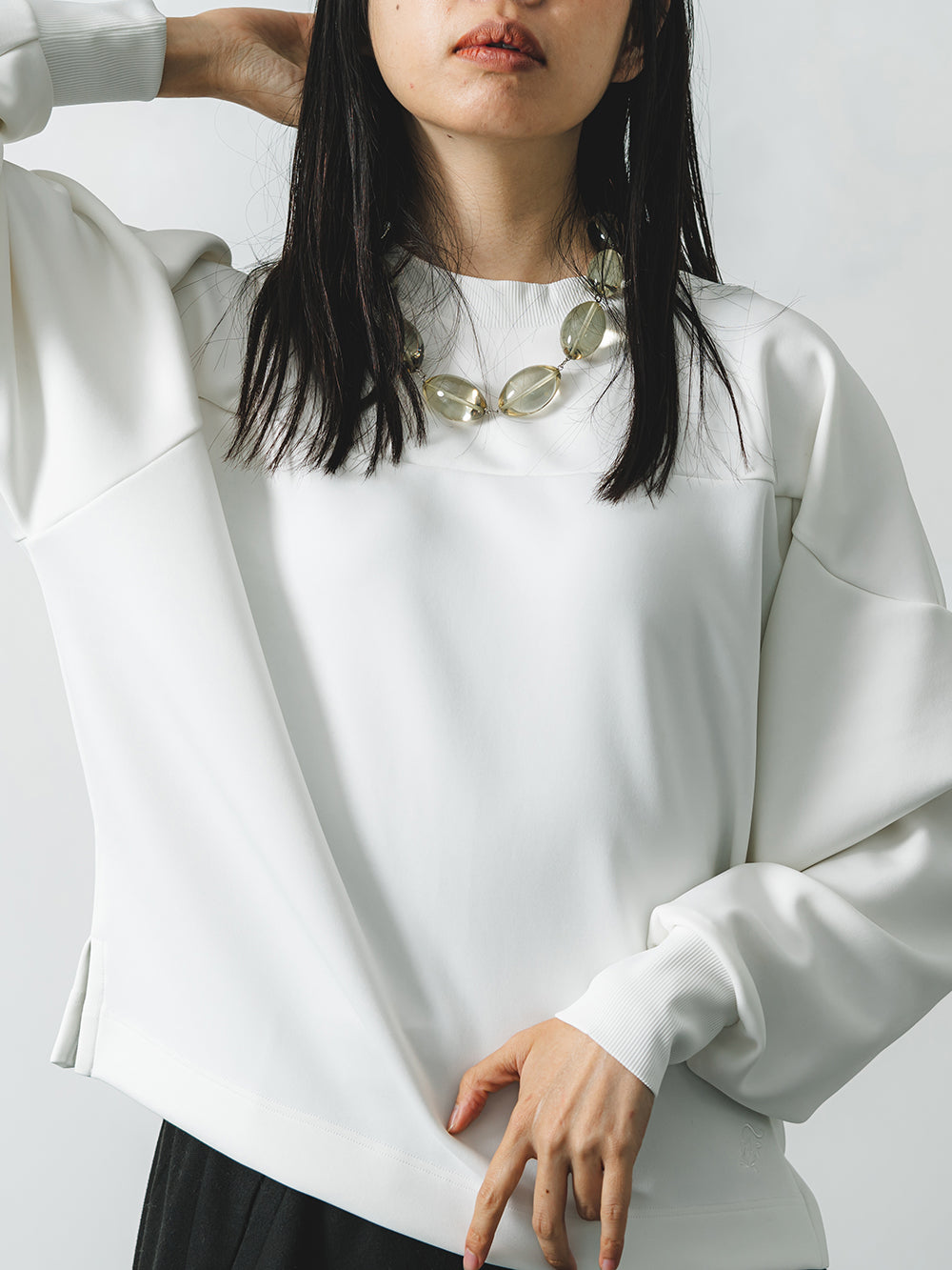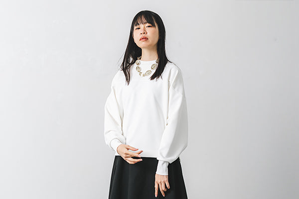 ボトムスやアクセサリーなど合わせるもので印象が変わる汎用性の高さが魅力。胸の切り替えやサイドにさりげなく入ったスリットで洒落感をアップ。ネックとリブのストレッチ素材で着やすさはもちろん、手首にやさしくフィットし、程よい腕のだぼつきが女性らしいデザインです。