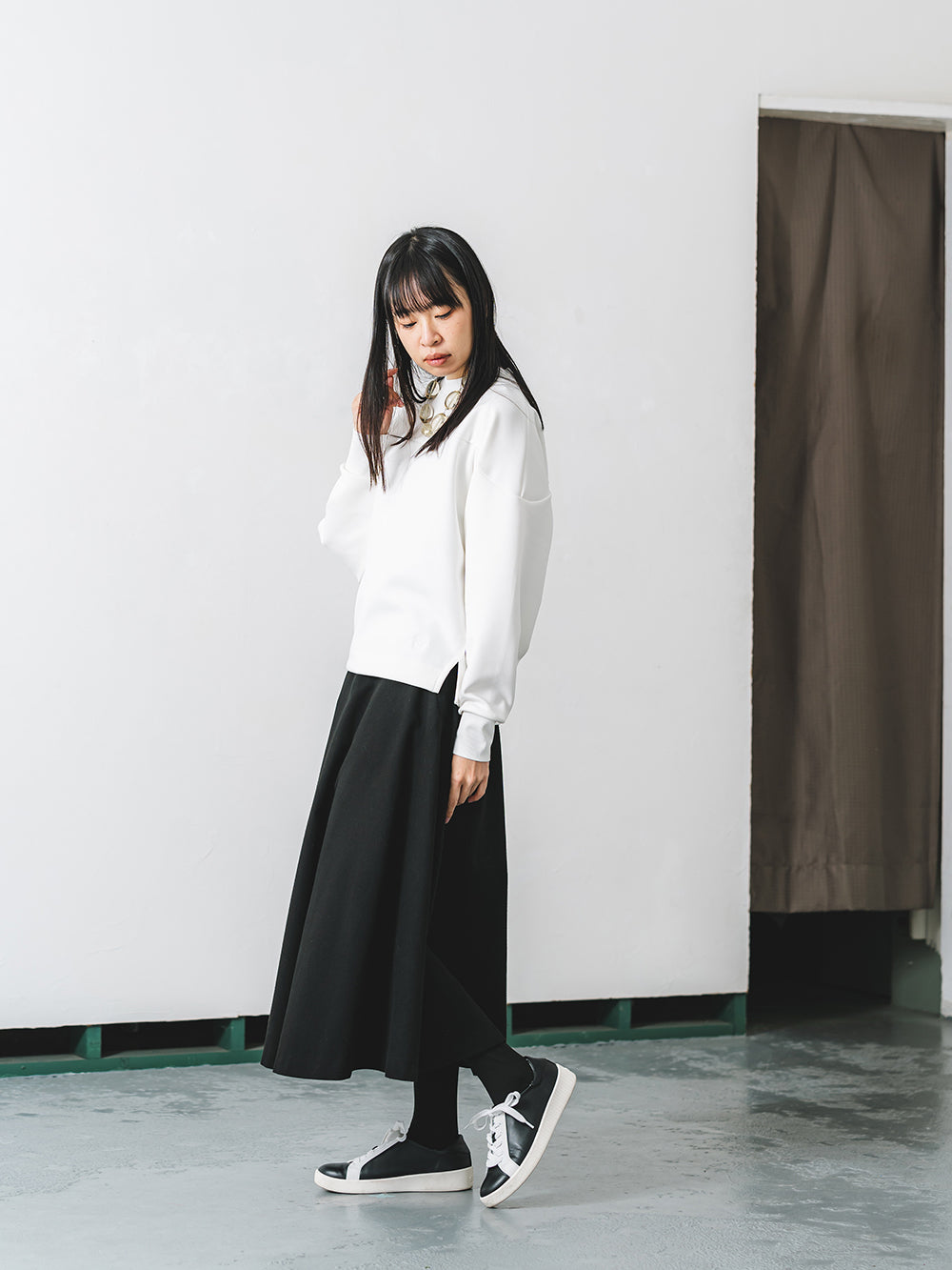 さらりと光沢のある、シワになりにくい素材で上品な装いを演出。スリットの入ったサイドもアクセントとなっており、腰周りがつっかえません。リラックス感がありながらも、洗練された印象を保ちます。